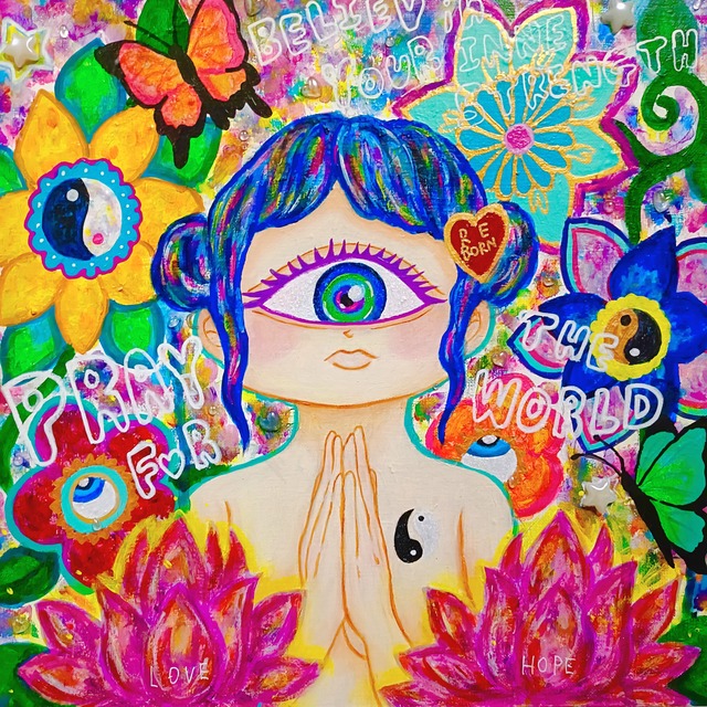 サイズ:S10号/510×510mm 技法:アクリル絵具,オイルパステル,金箔,ポスカ 現代人はただ、目の前にあるモノをみているだけで何も感じ取れない。 見えるモノしか見ようとせず、またそれこそが全てで正しいと思い込みながら生きている。 第六感、見えないエネルギーを感じ取る 便利さに寄りかかり想像力に乏しく攻撃的で平和とはかけ離れてしまった全人類にへ。 見えない力を感じ取り信じる勇気を与えたい。
