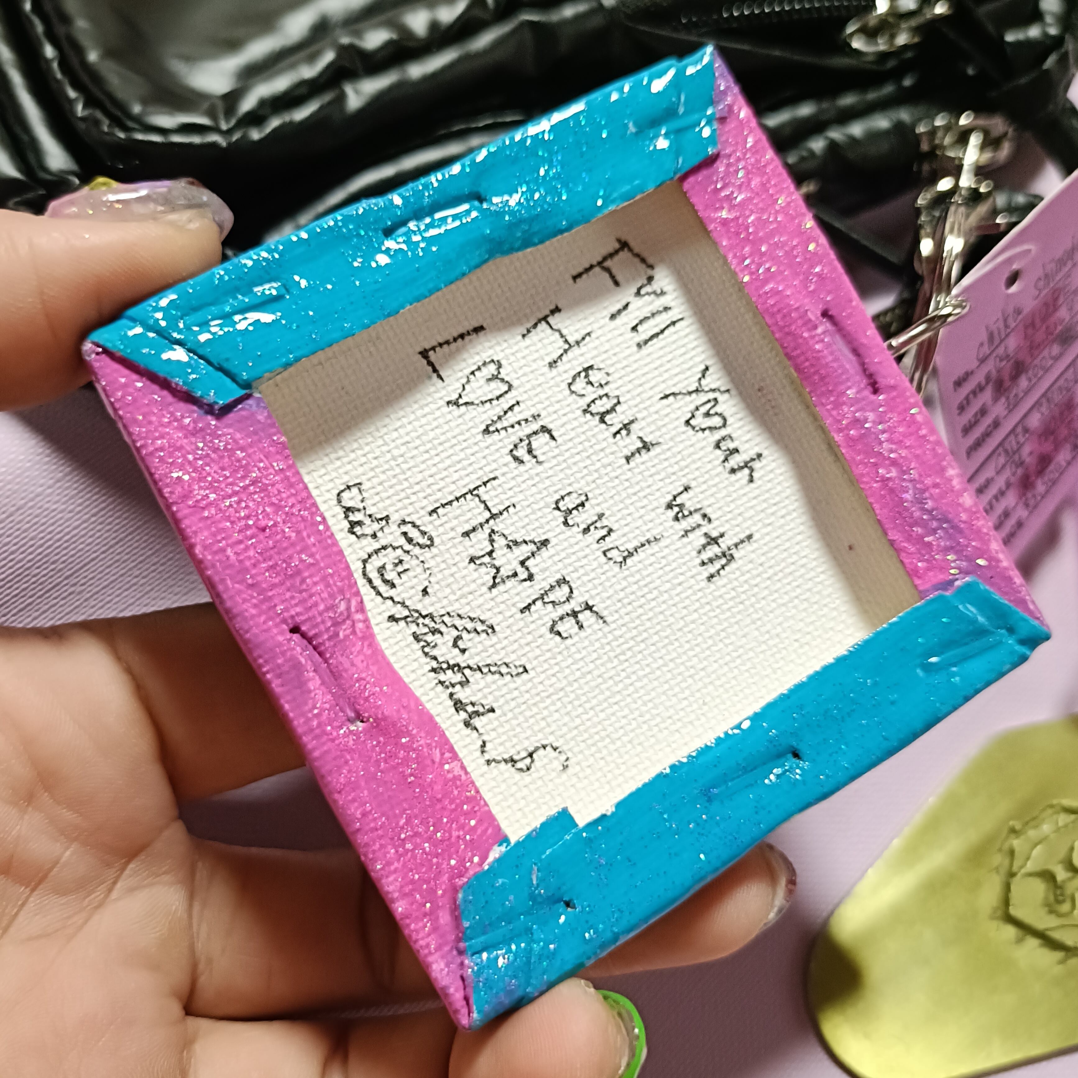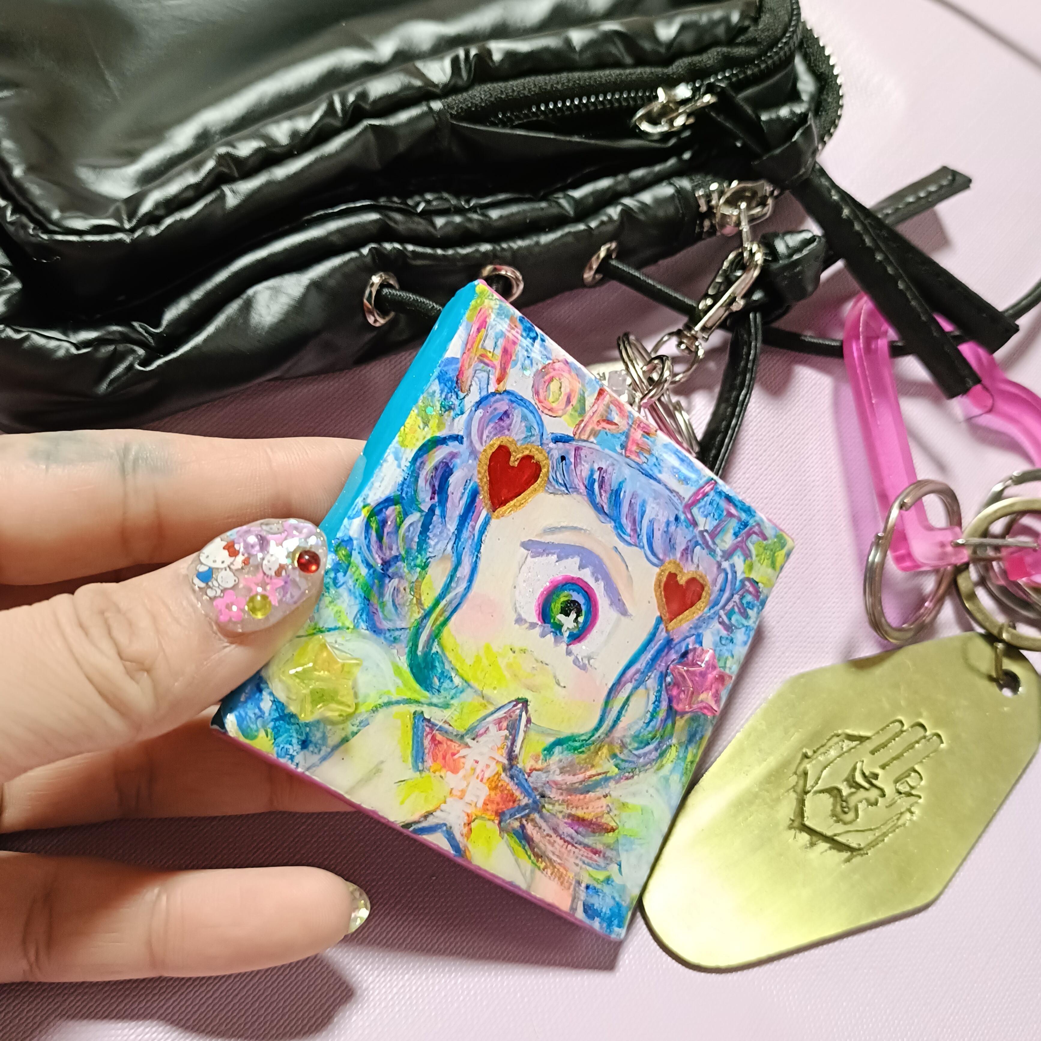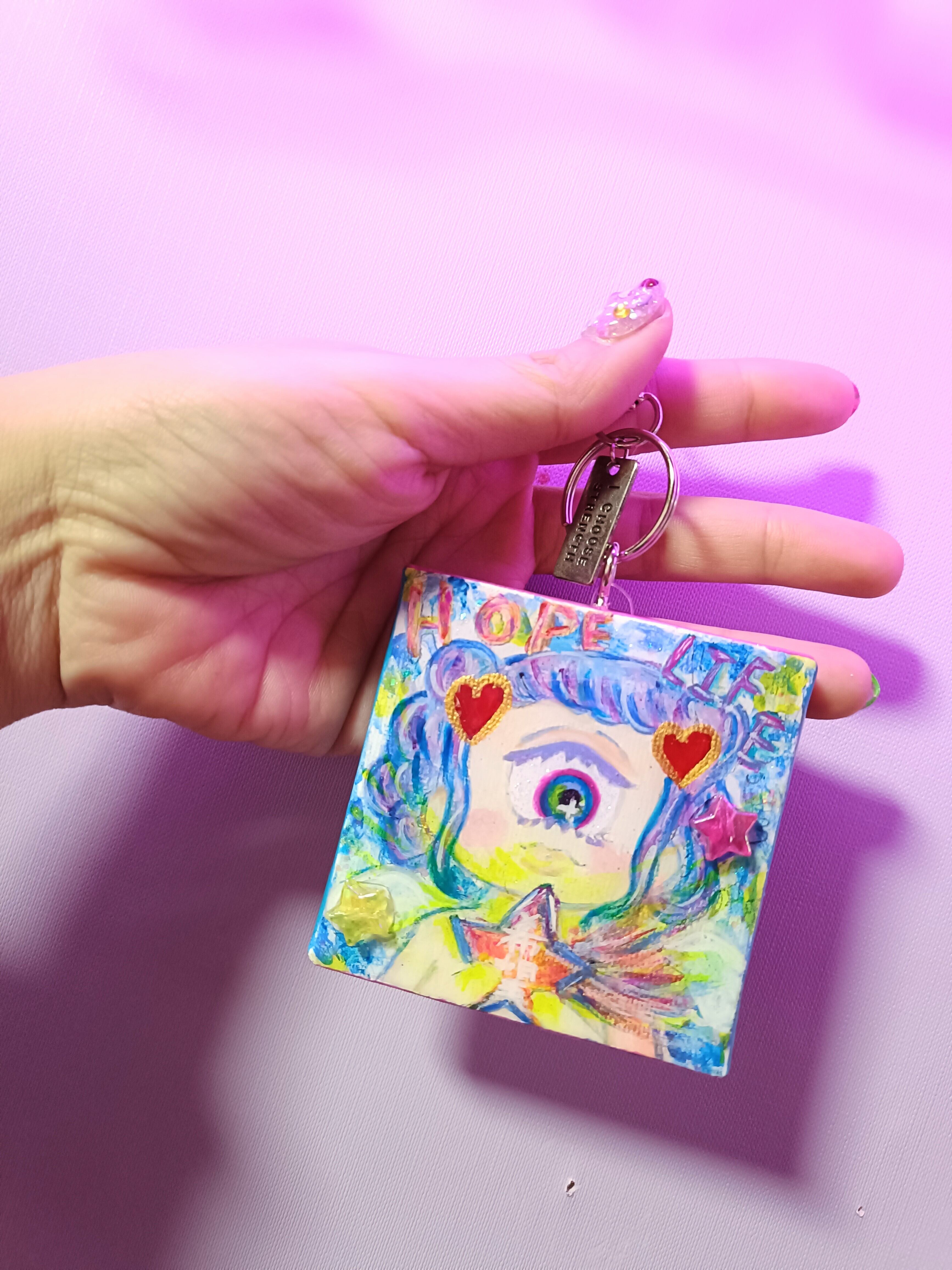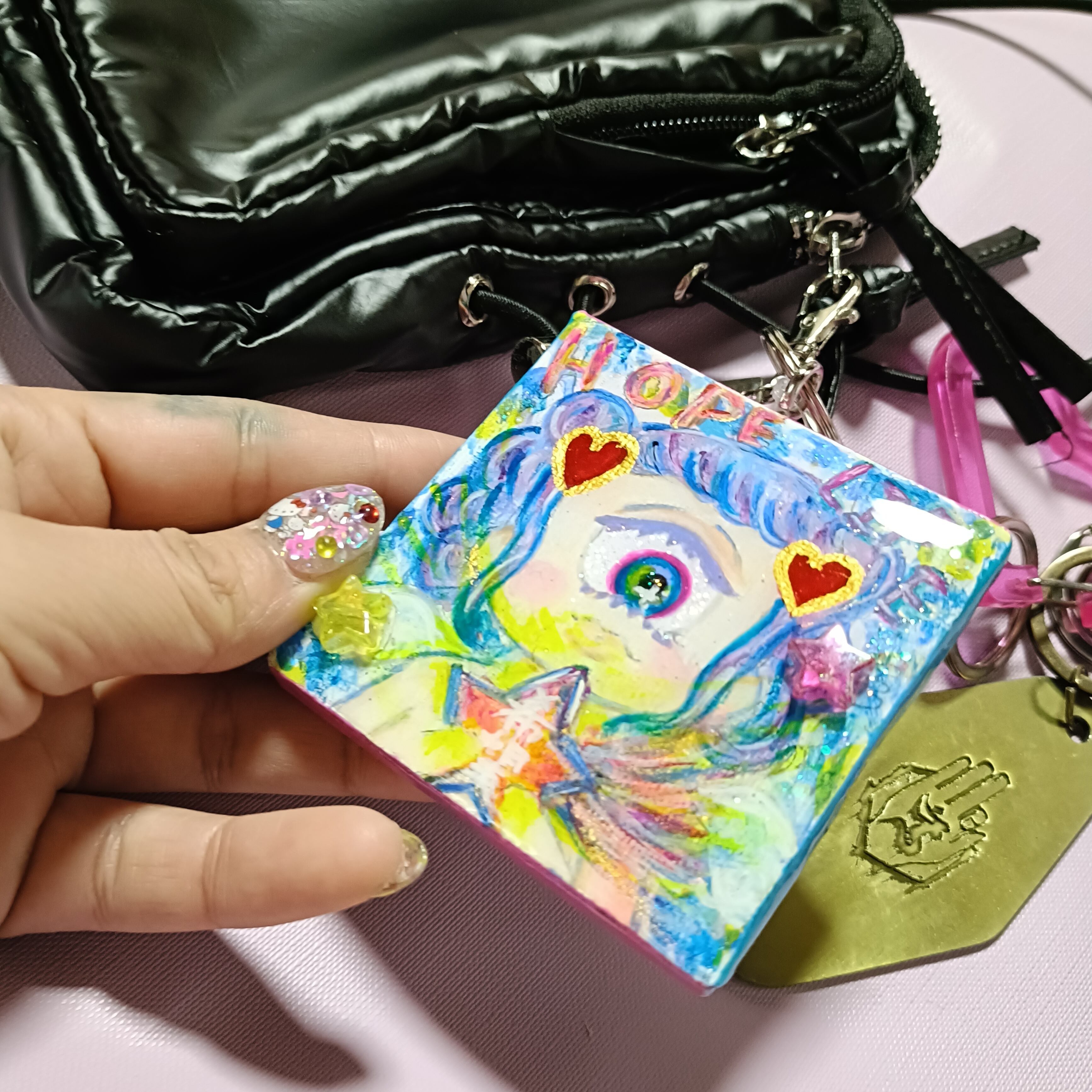 ミニキャンバスに手描きで描いたアートの上からレジンで加工した一点物の原画キーホルダーです。