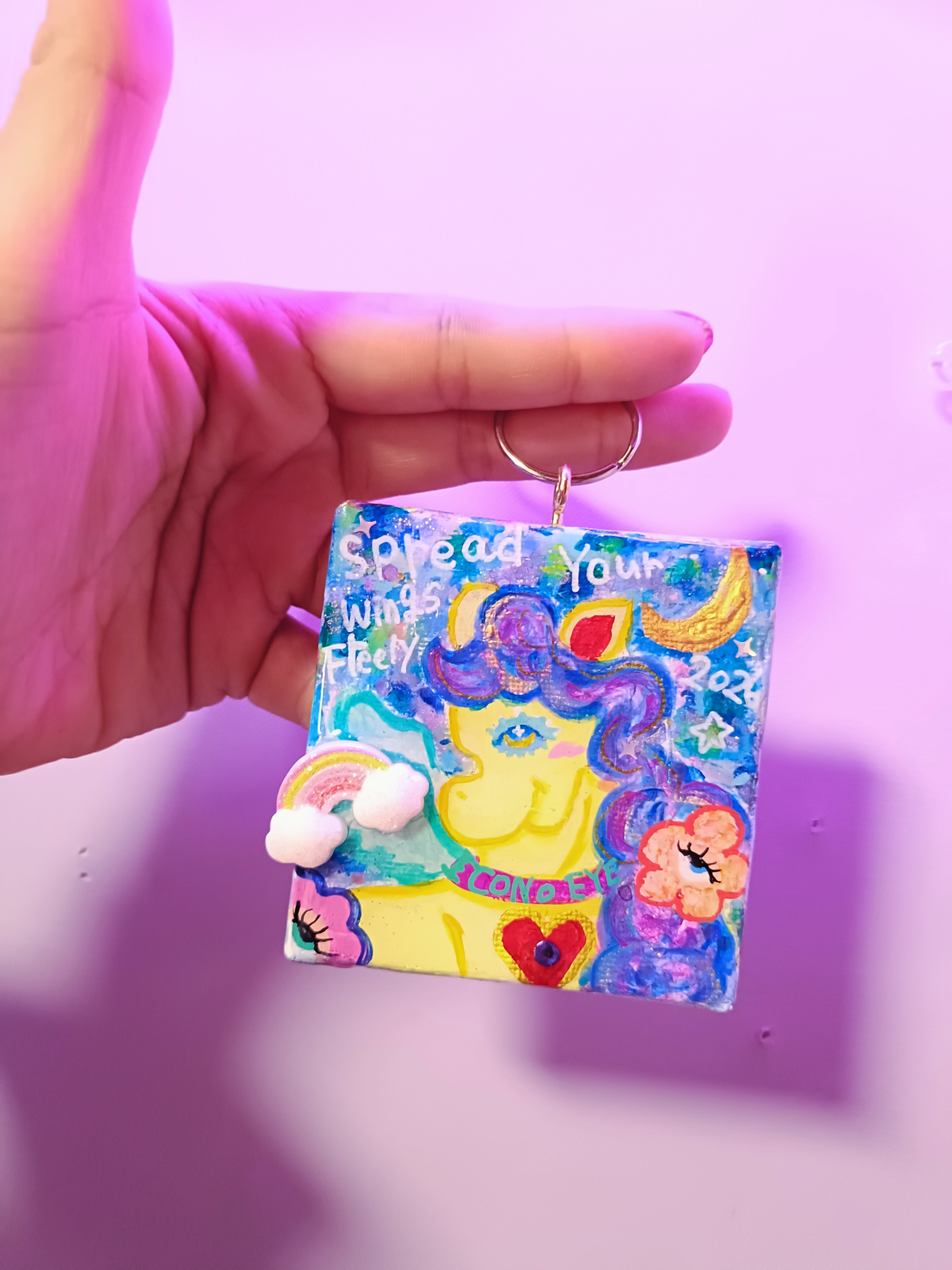 ミニキャンバスに手描きで描いたアートの上からレジンで加工した一点物の原画キーホルダーです。