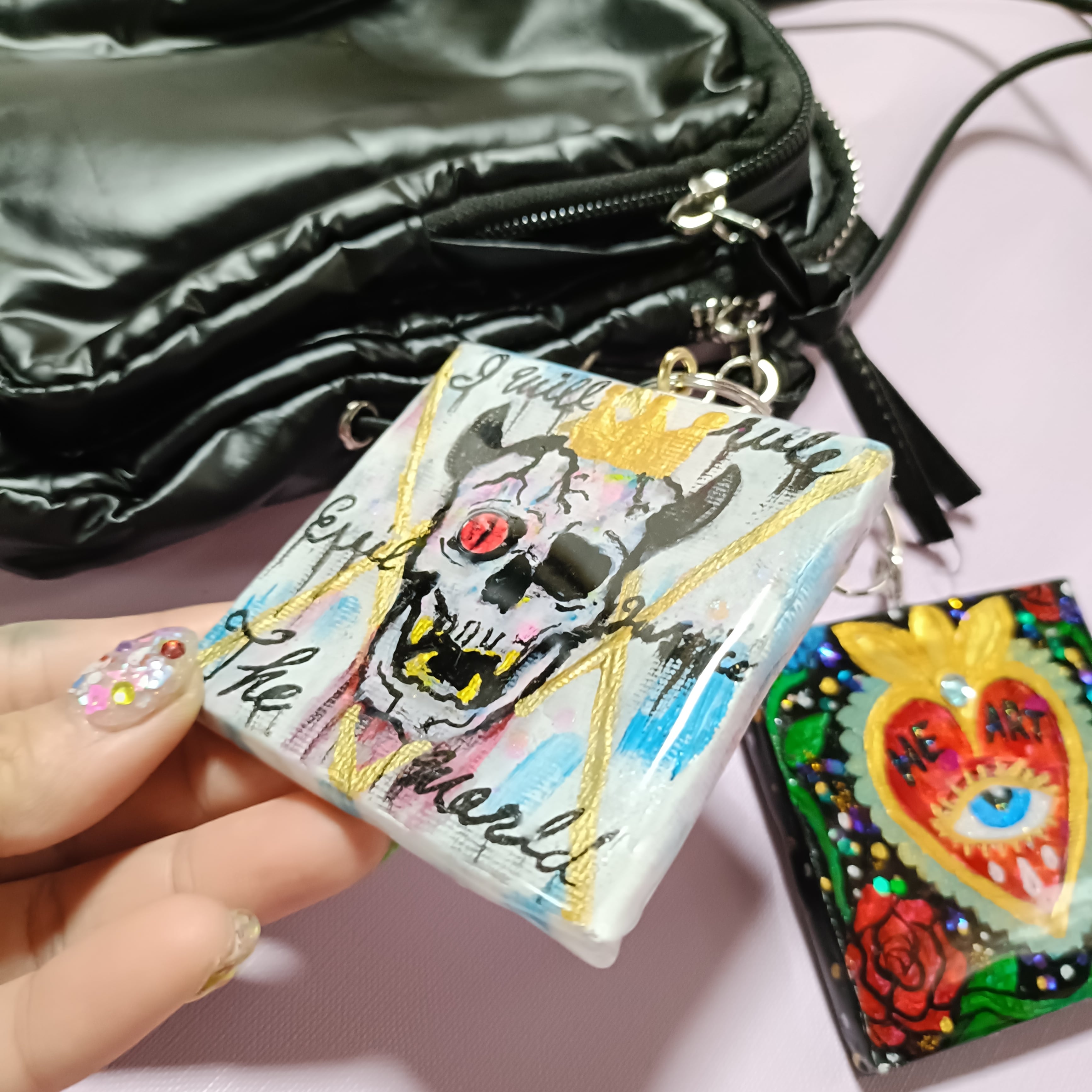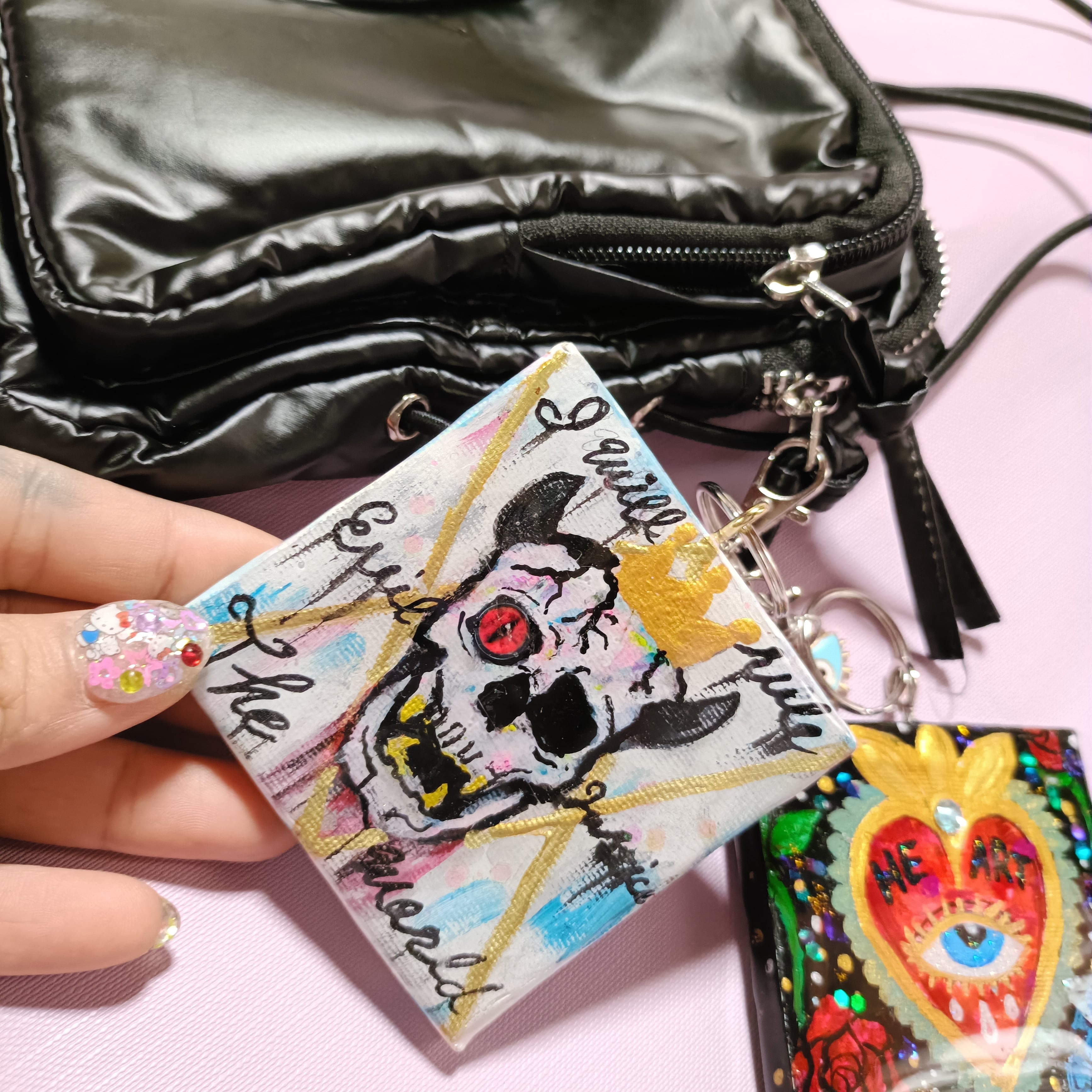ミニキャンバスに手描きで描いたアートの上からレジンで加工した一点物の原画キーホルダーです。