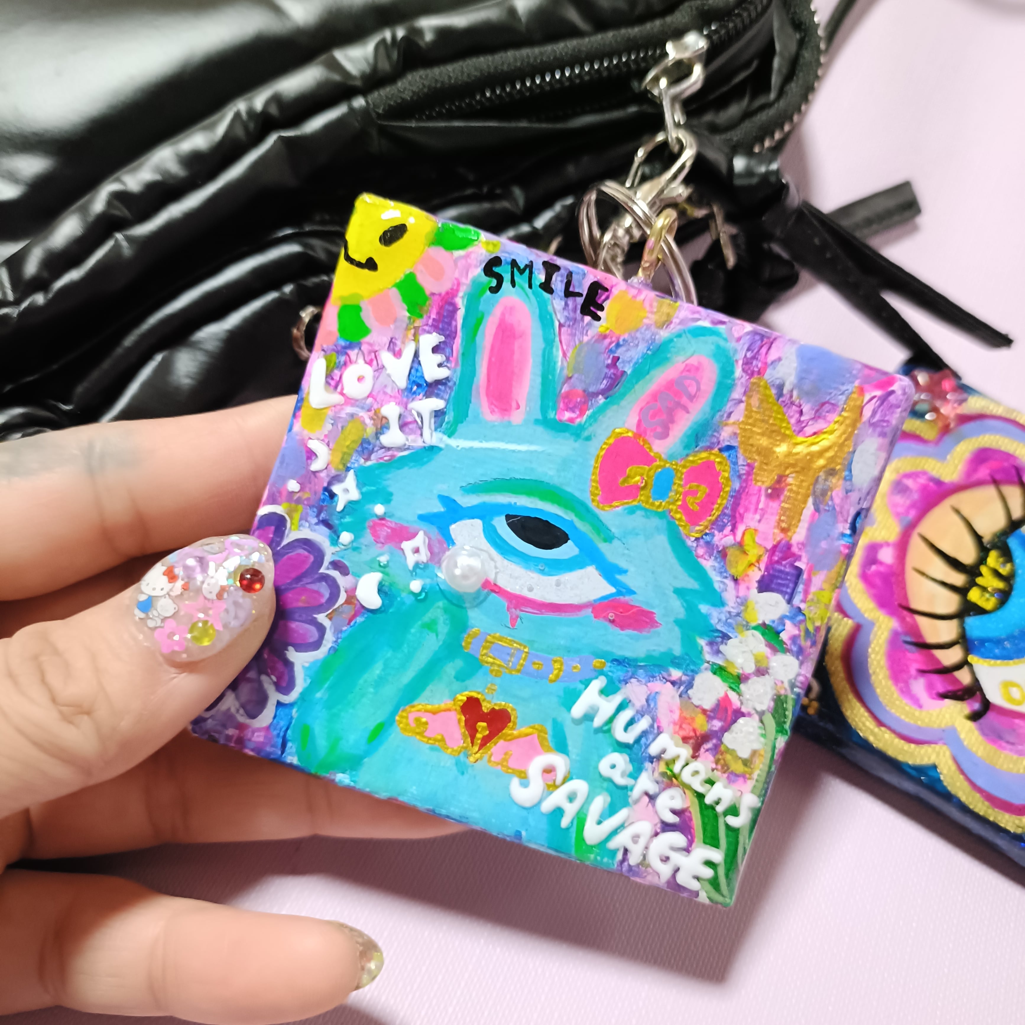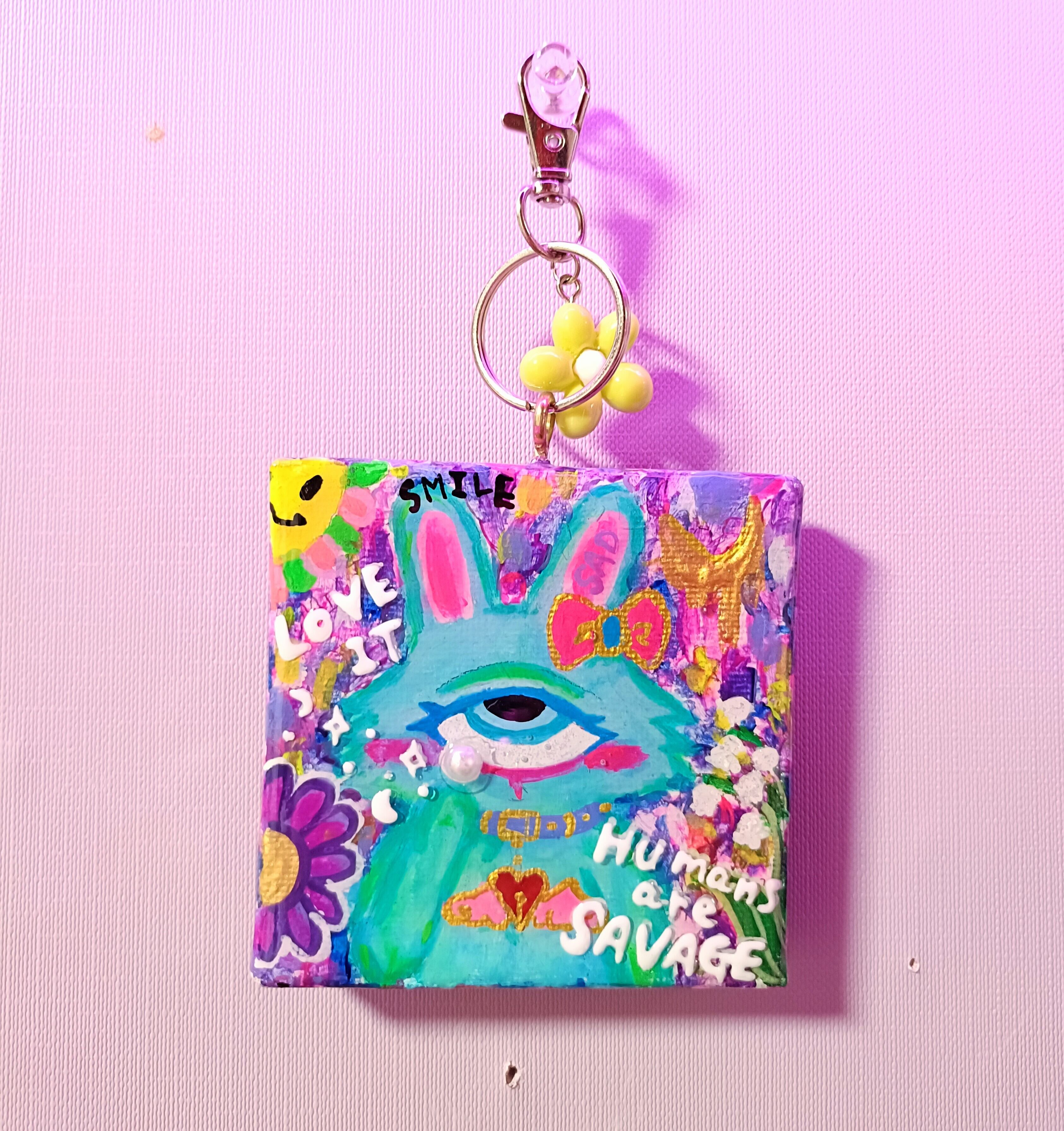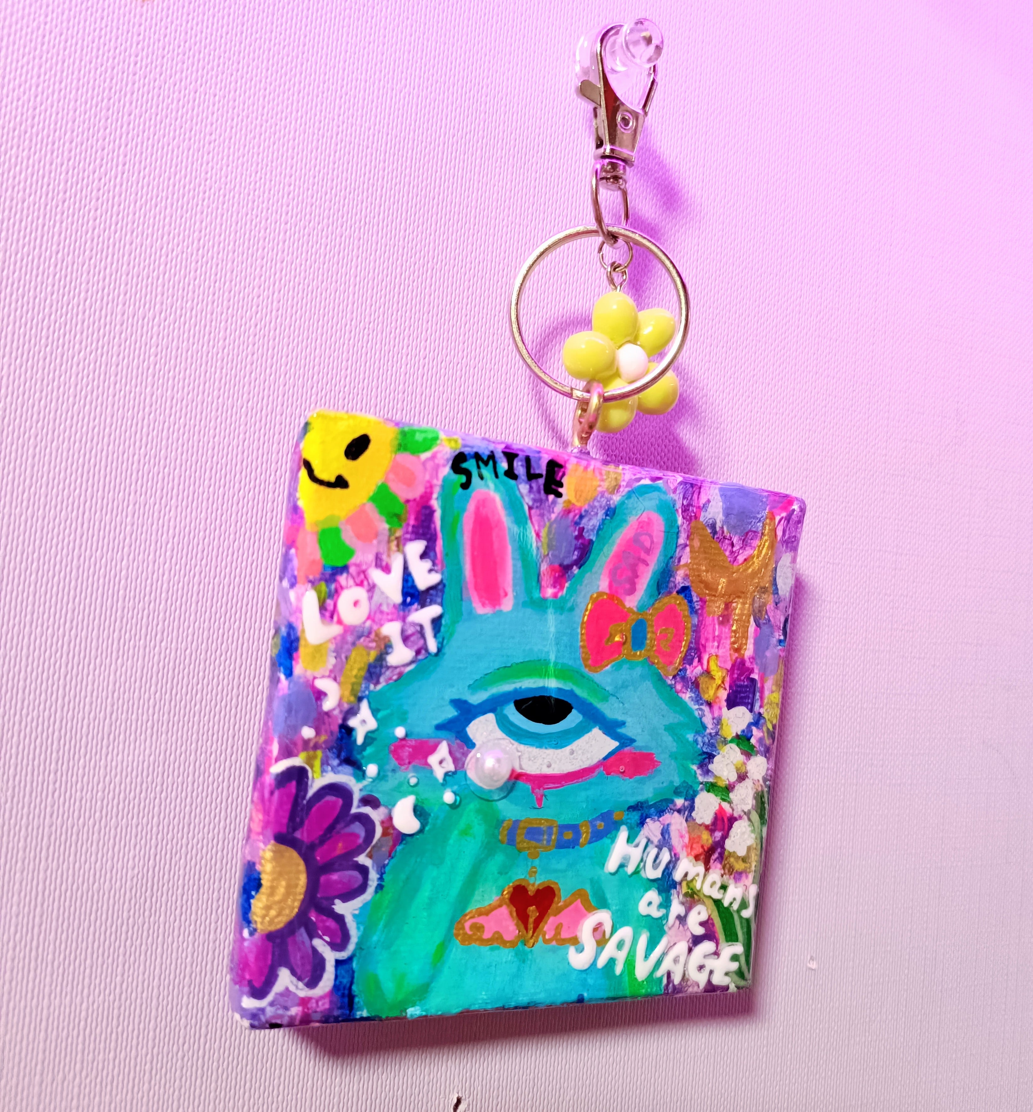 ミニキャンバスに手描きで描いたアートの上からレジンで加工した一点物の原画キーホルダーです。