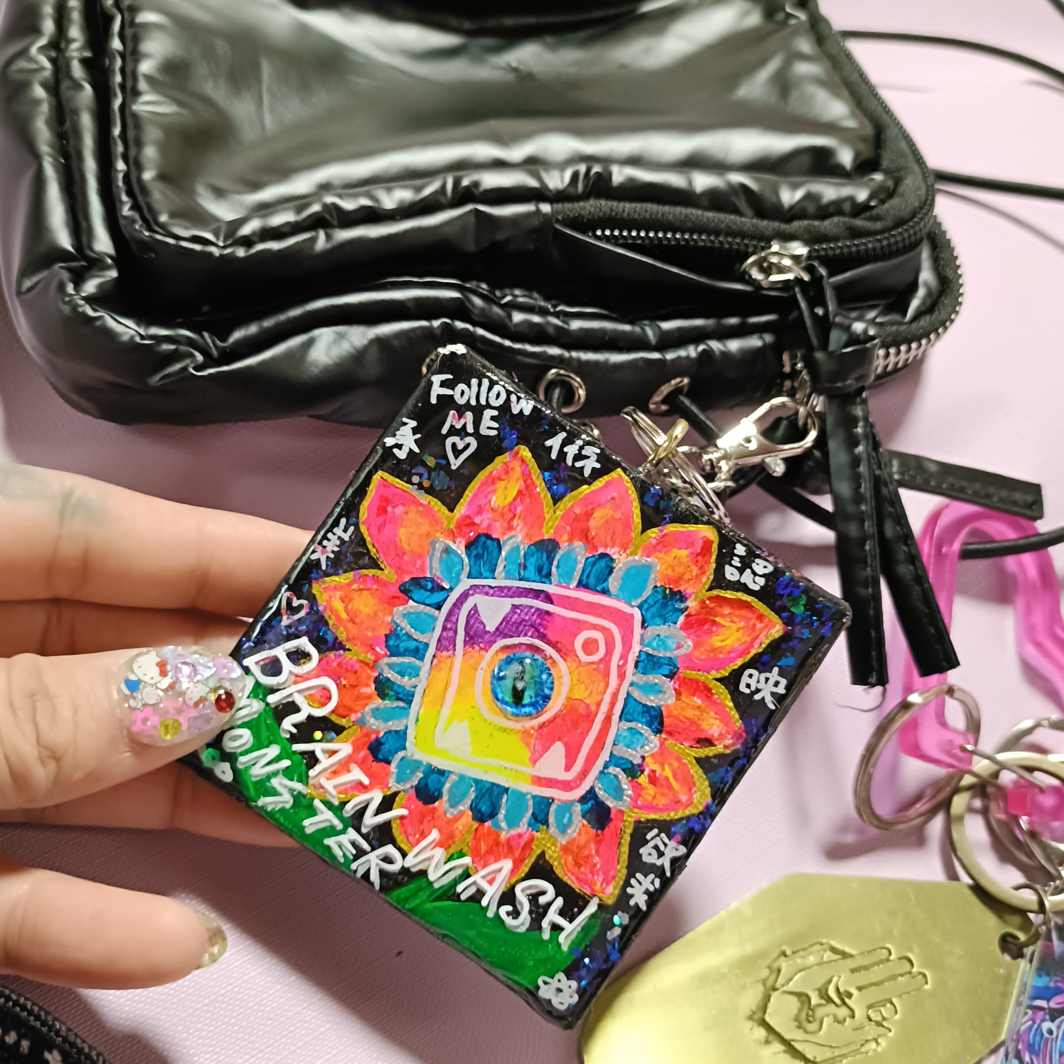 ミニキャンバスに手描きで描いたアートの上からレジンで加工した一点物の原画キーホルダーです。