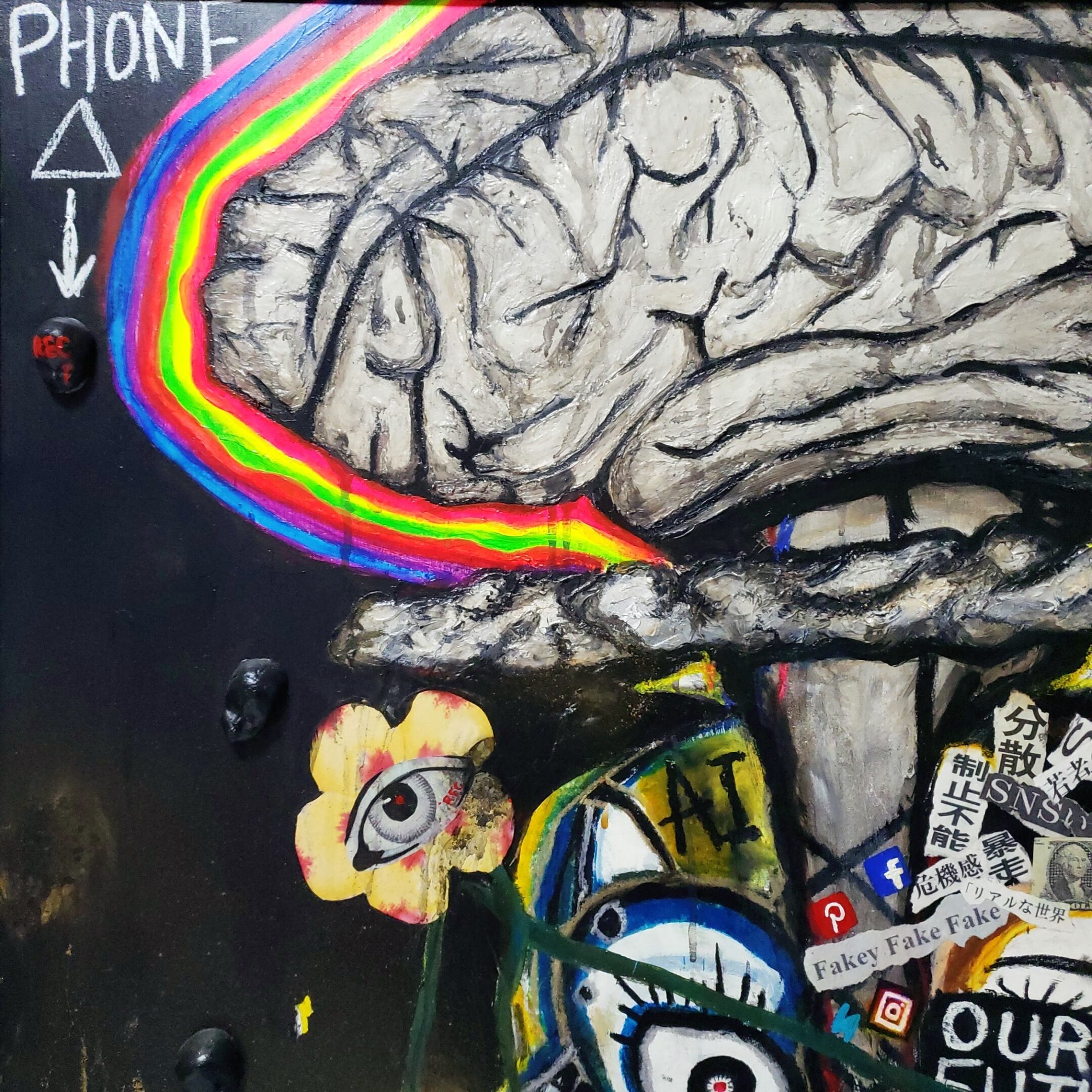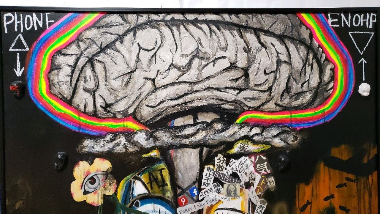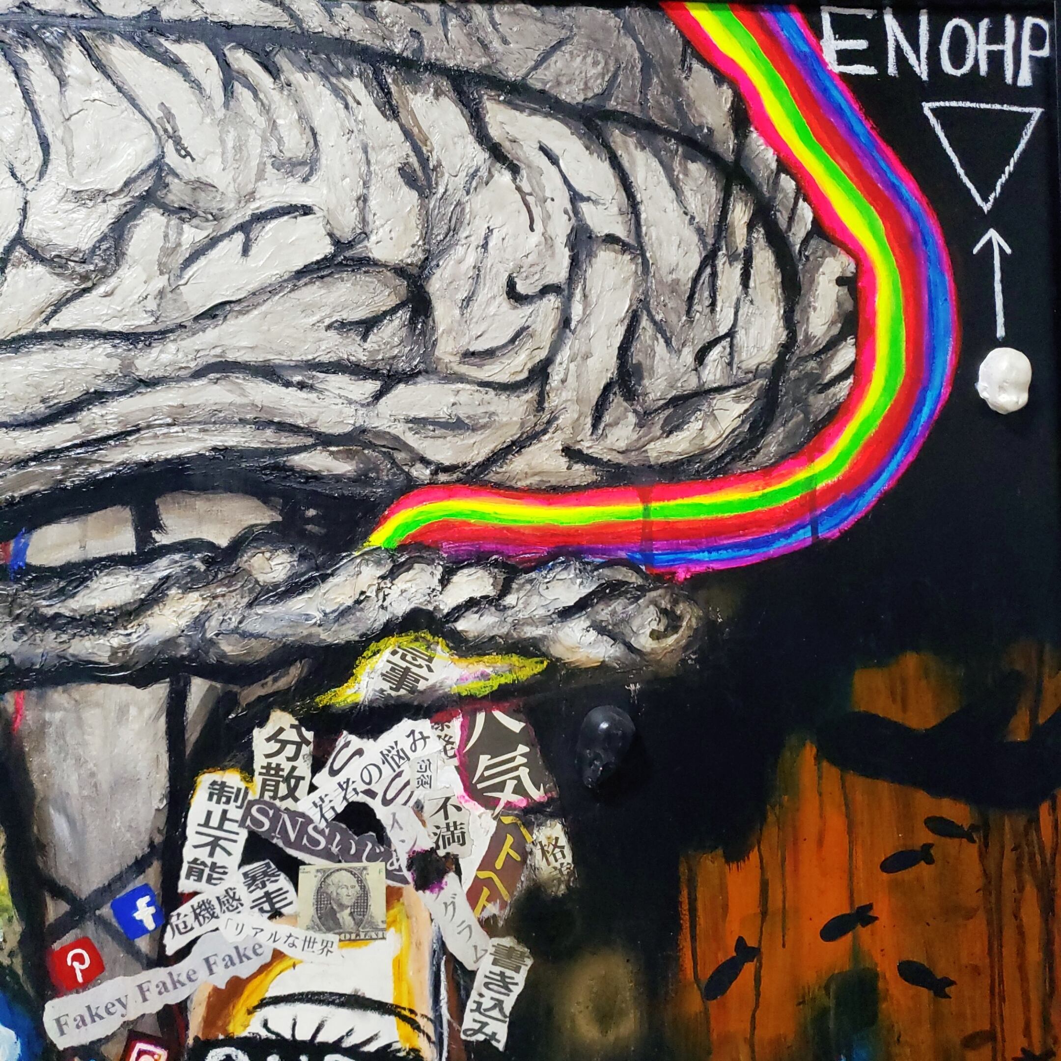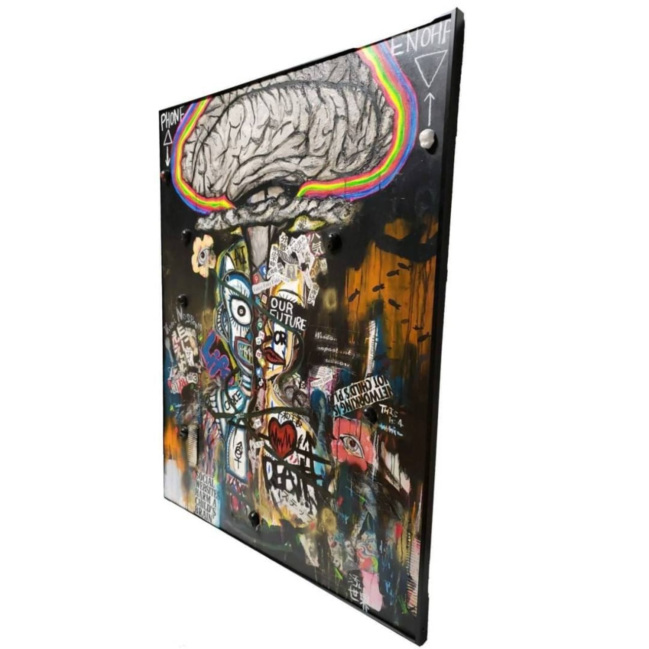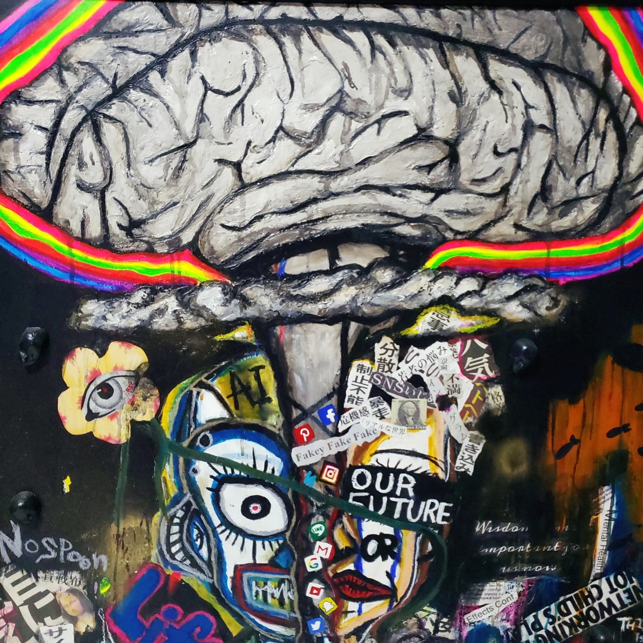 The large brain was created with modeling paste to give it a three-dimensional effect, and then collaged and painted with the atomic bomb as a motif.