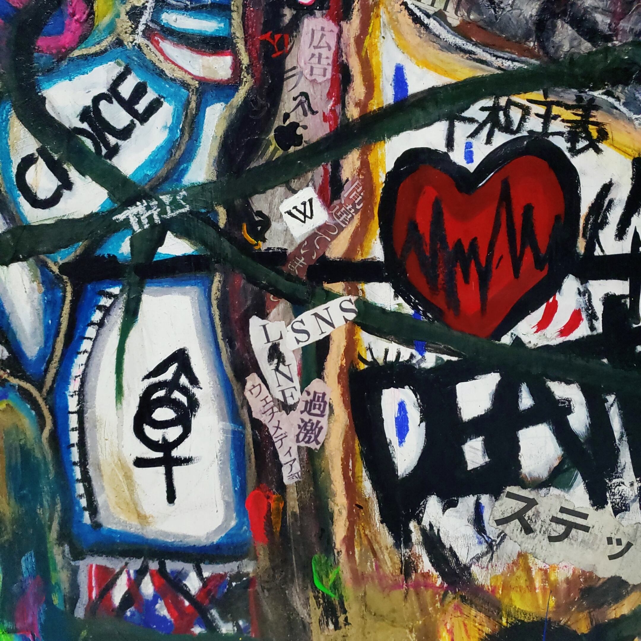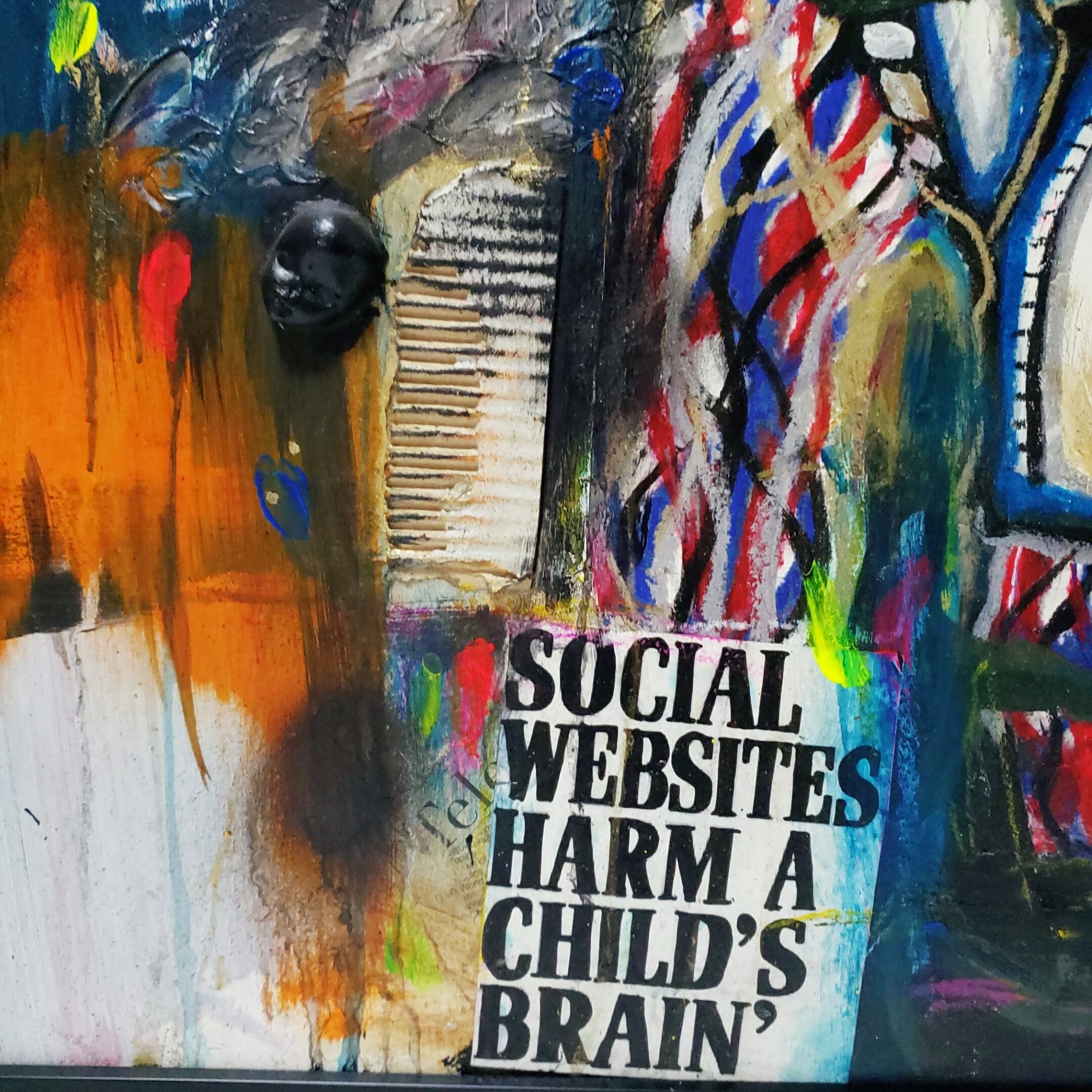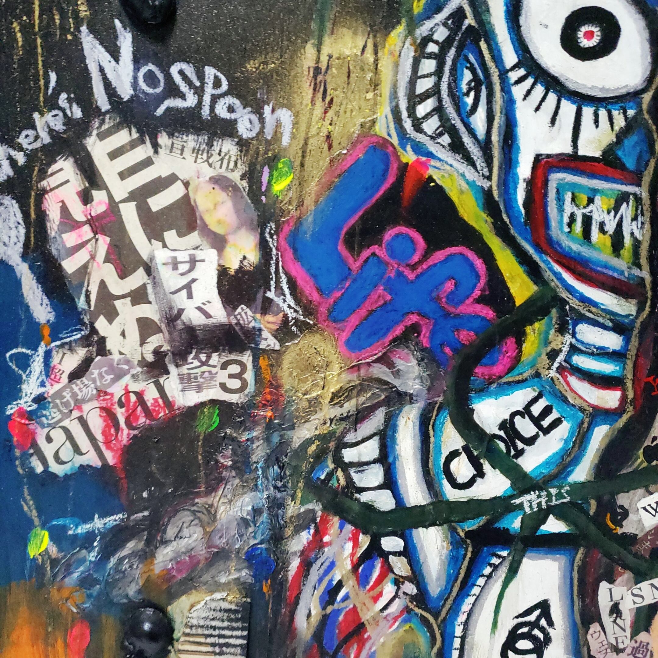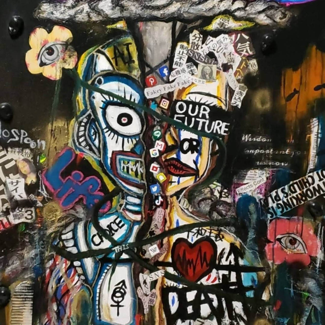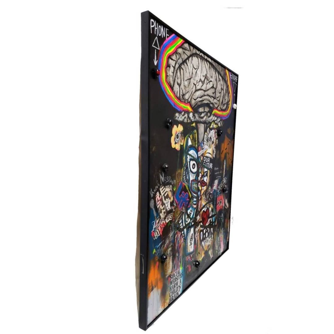 The large brain was created with modeling paste to give it a three-dimensional effect, and then collaged and painted with the atomic bomb as a motif.