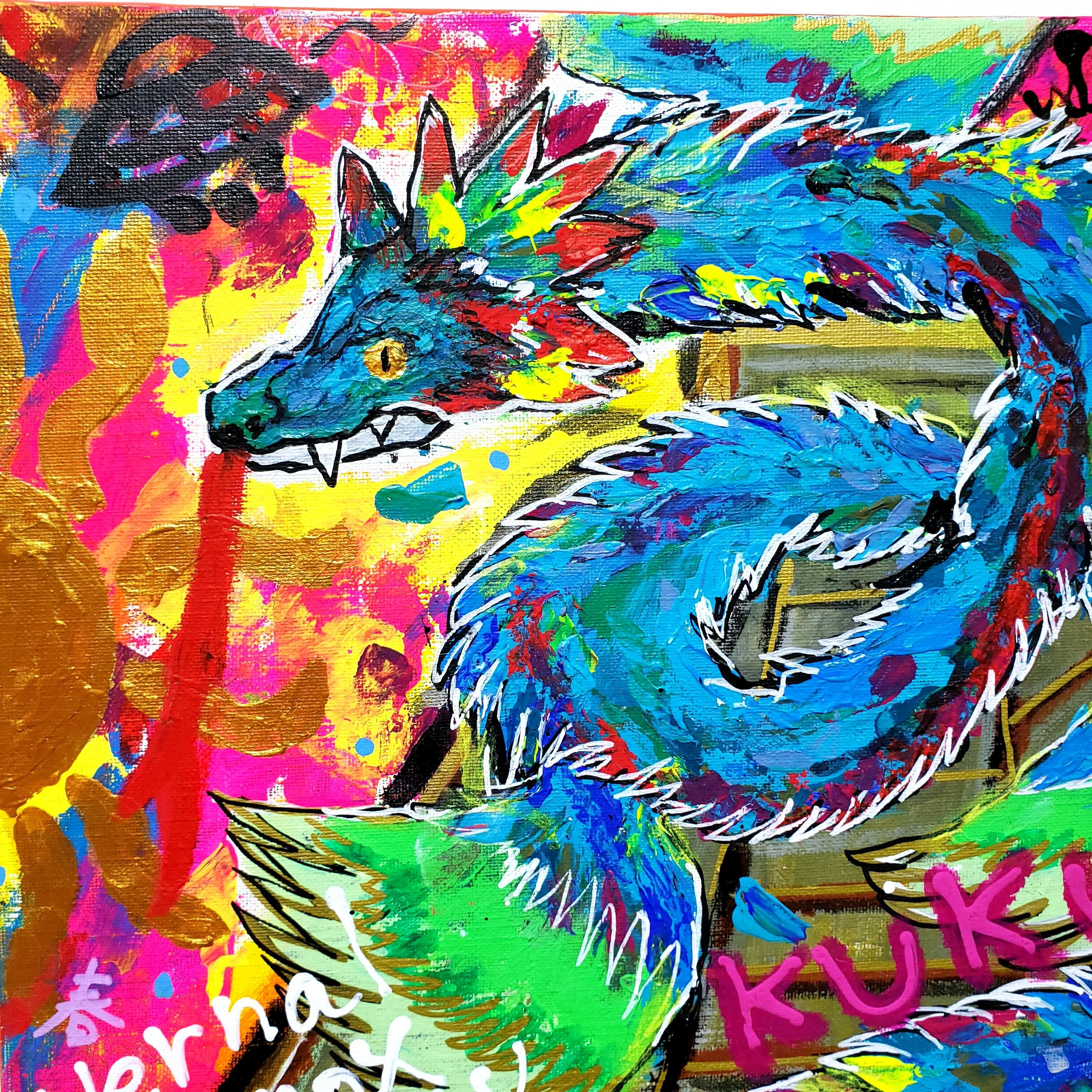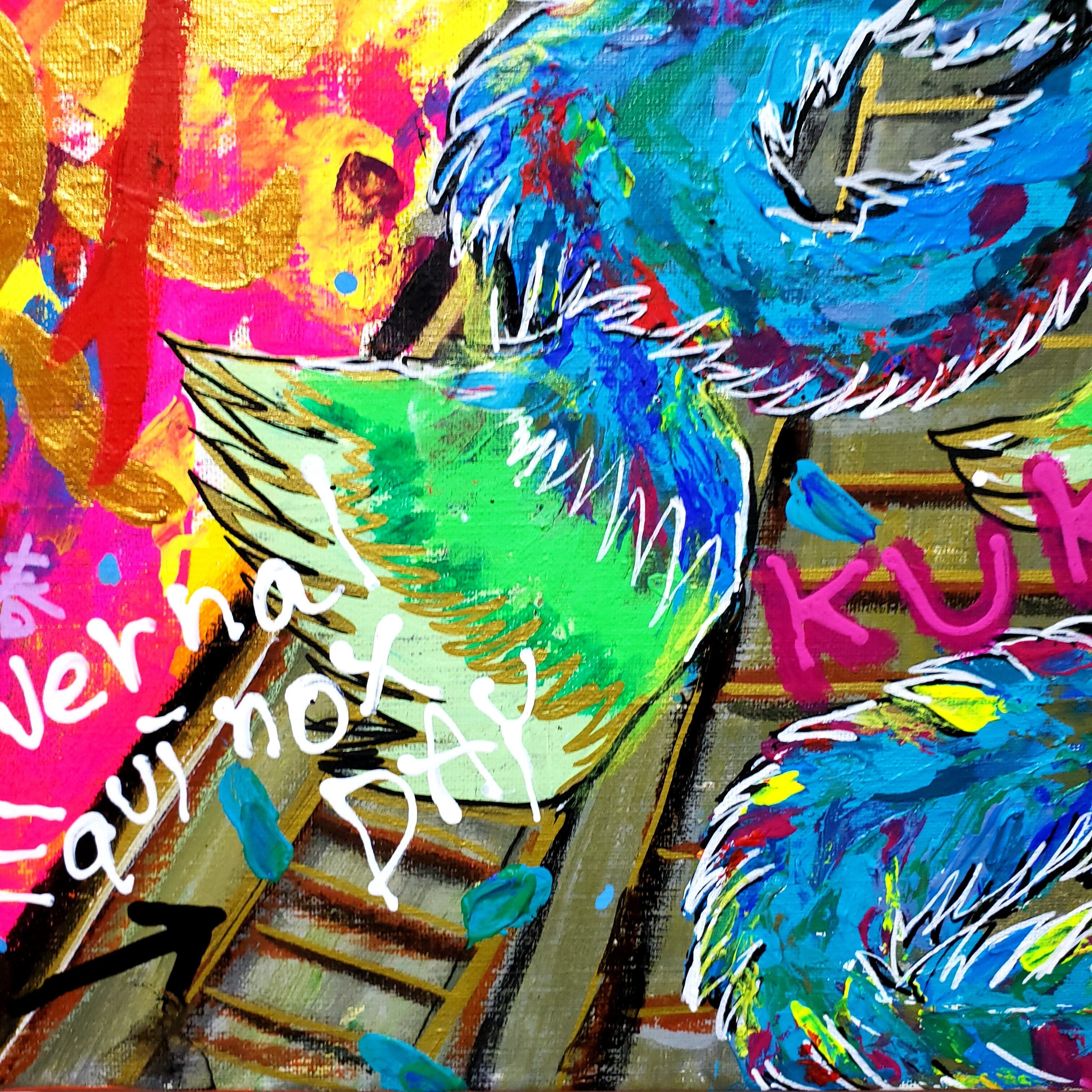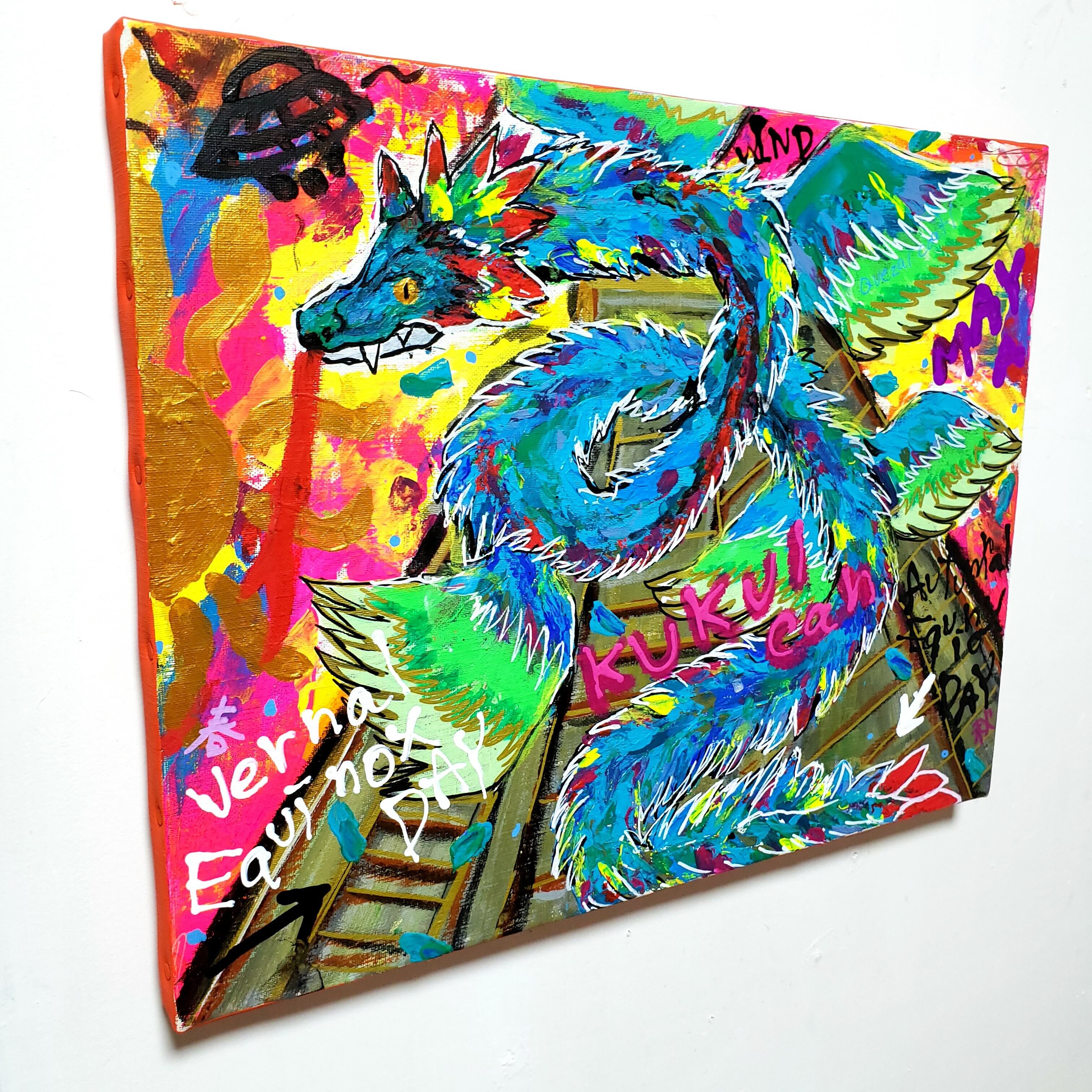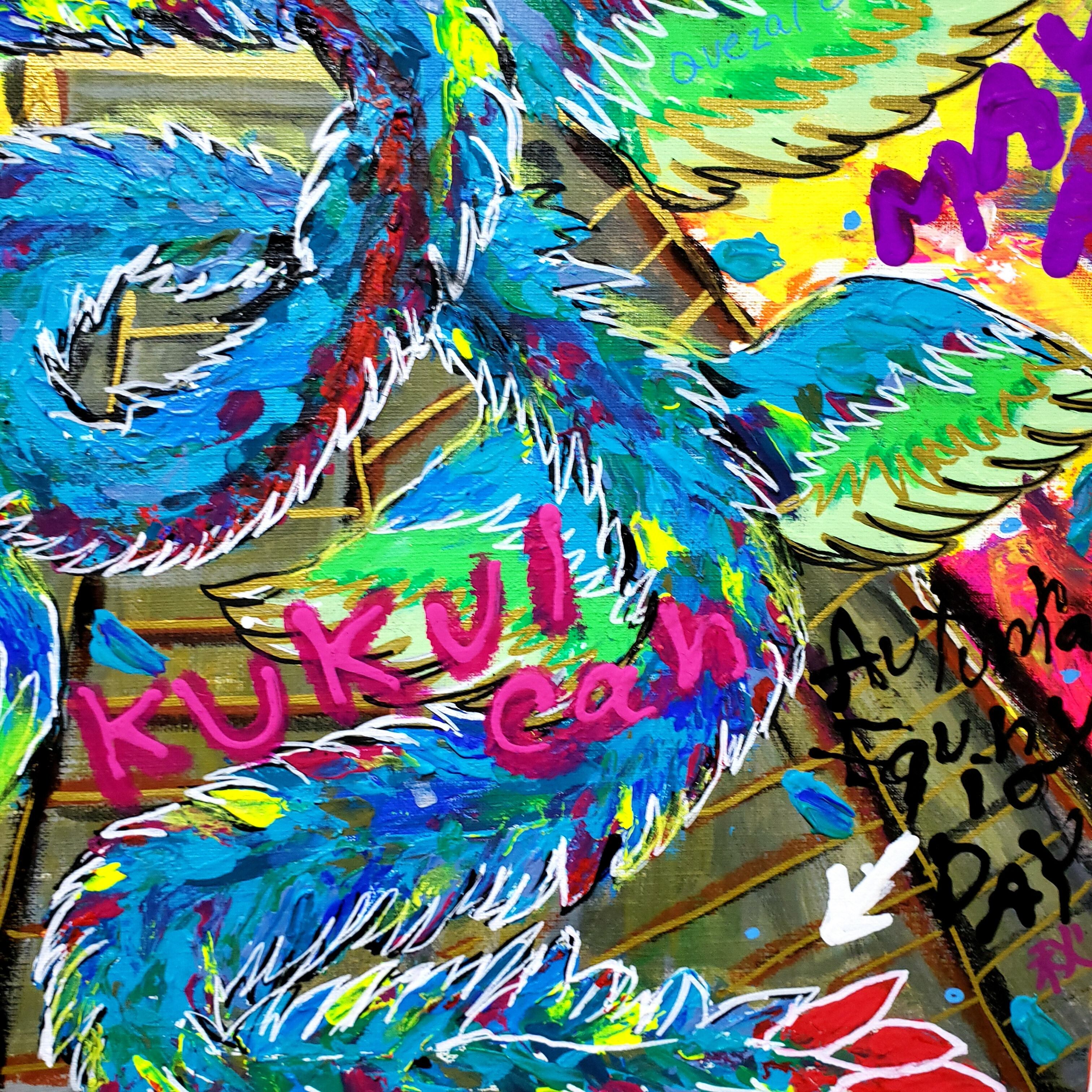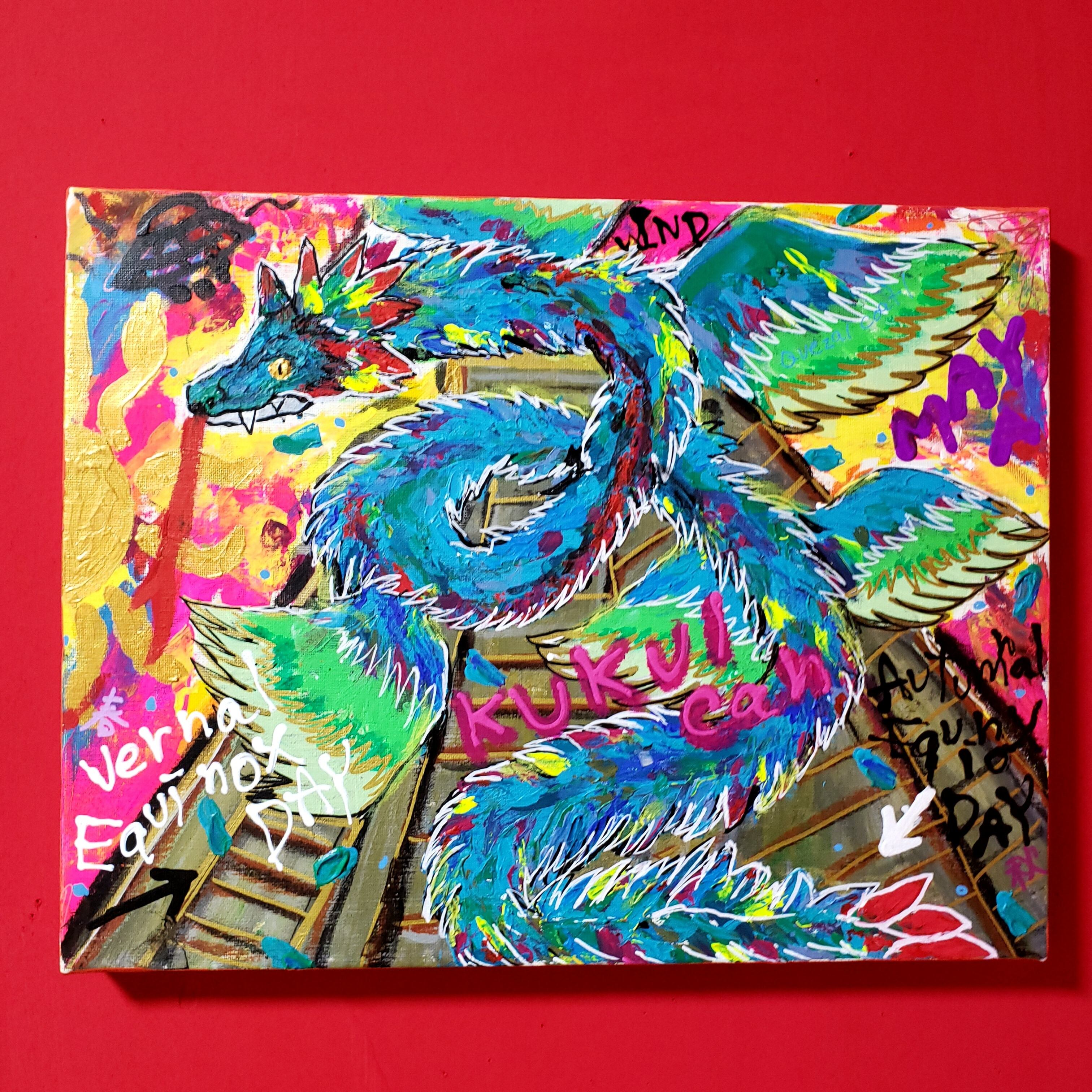 This work depicts the creator gods of the Mayan and Aztec civilizations and the temple Chechen Itza.