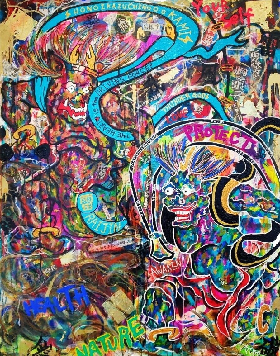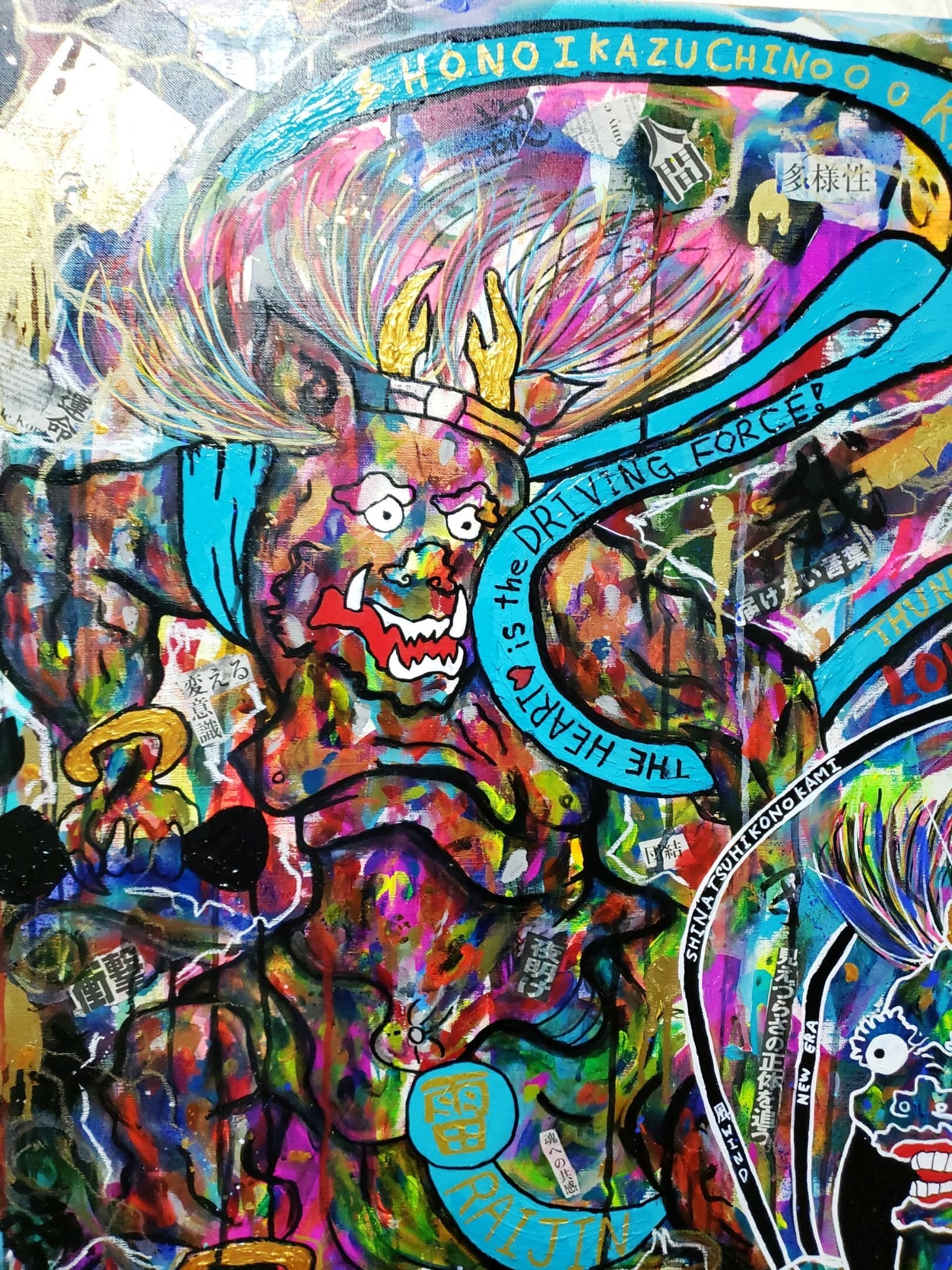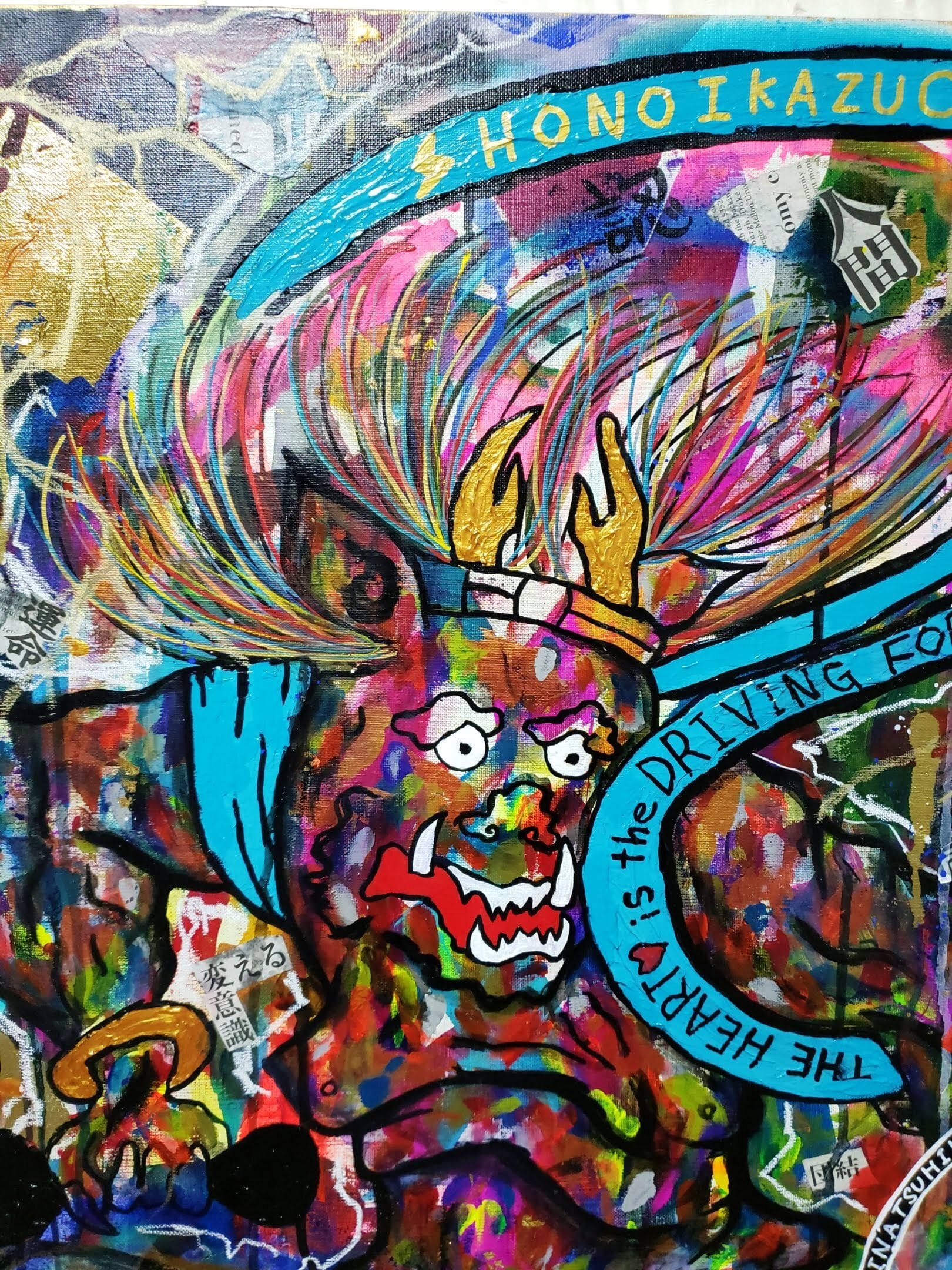 風神雷神には病気やケガ、悪から身を守る御利益がある事から堂々たるインパクトで描きたいと思いあらゆる色の絵の具を使い製作した1枚。