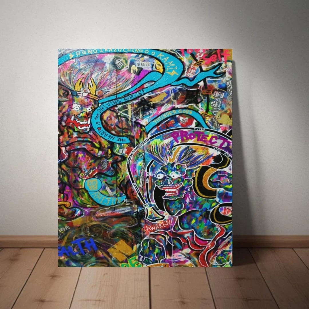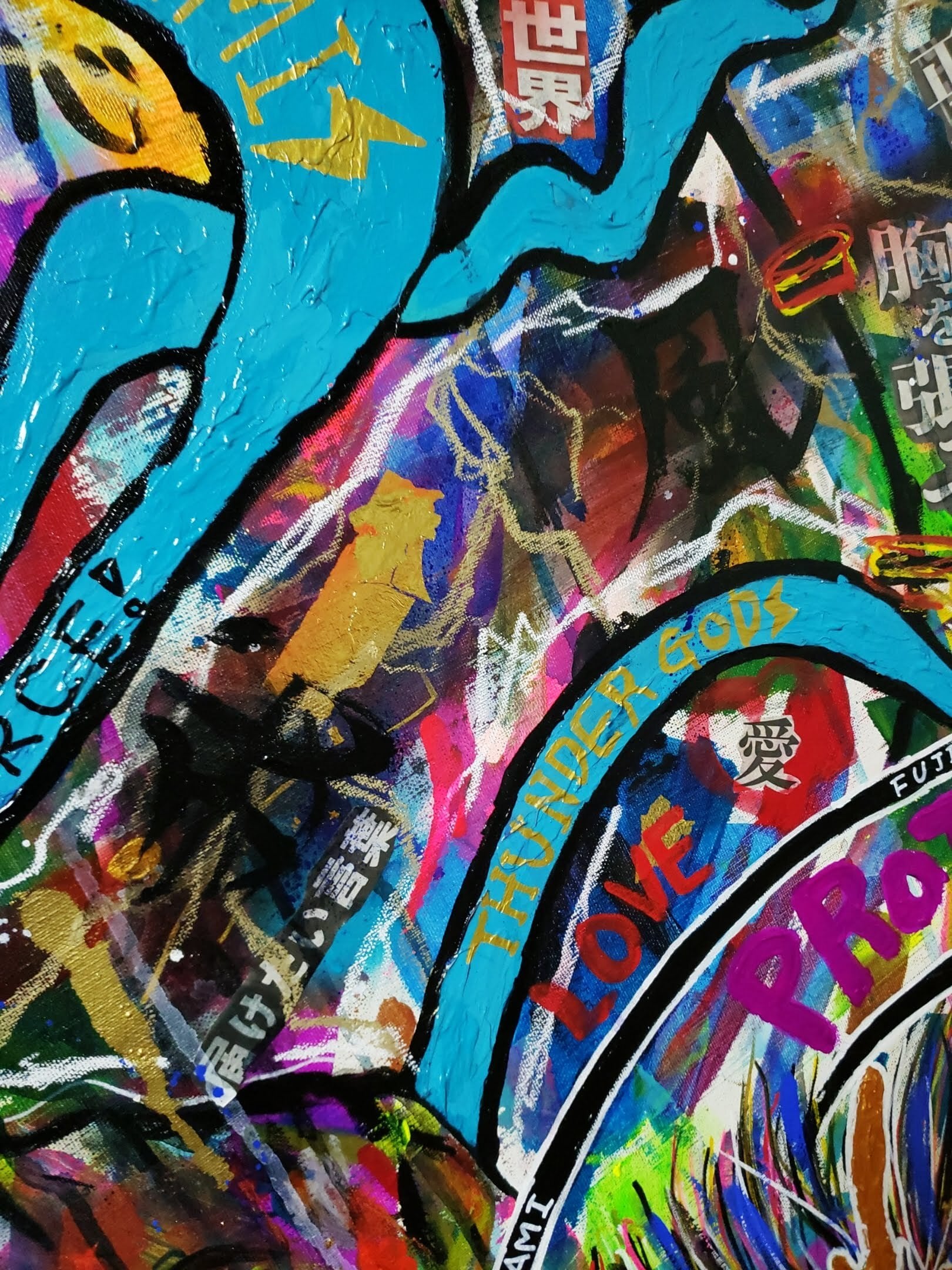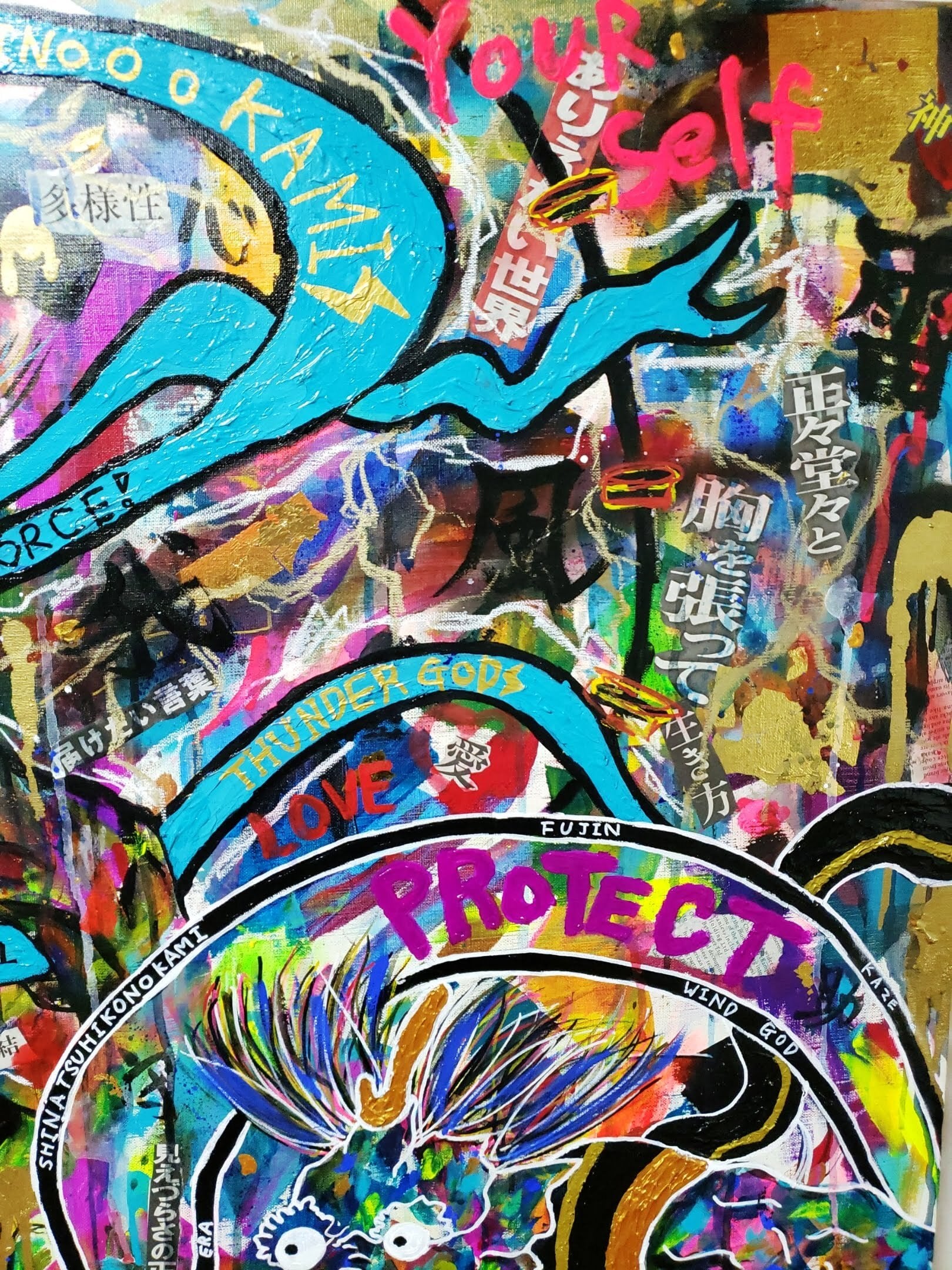 風神雷神には病気やケガ、悪から身を守る御利益がある事から堂々たるインパクトで描きたいと思いあらゆる色の絵の具を使い製作した1枚。