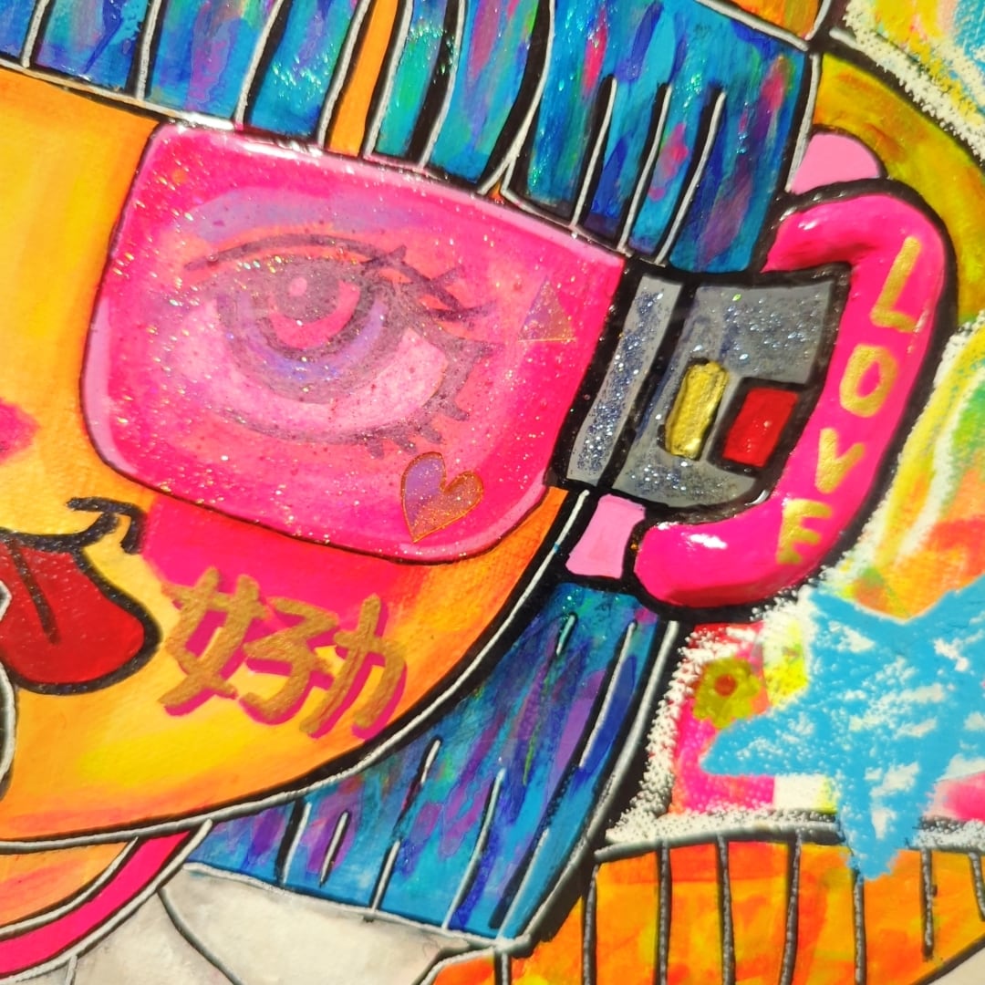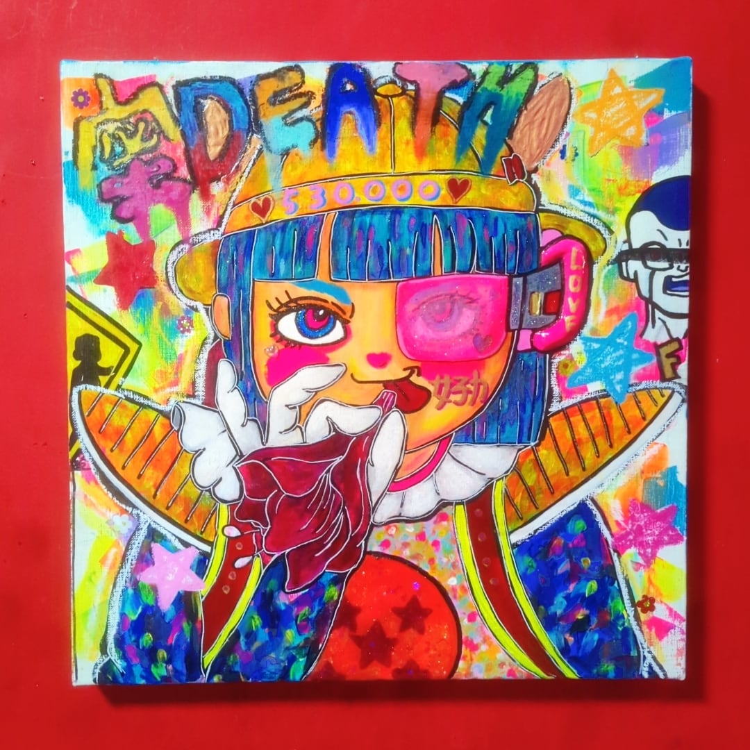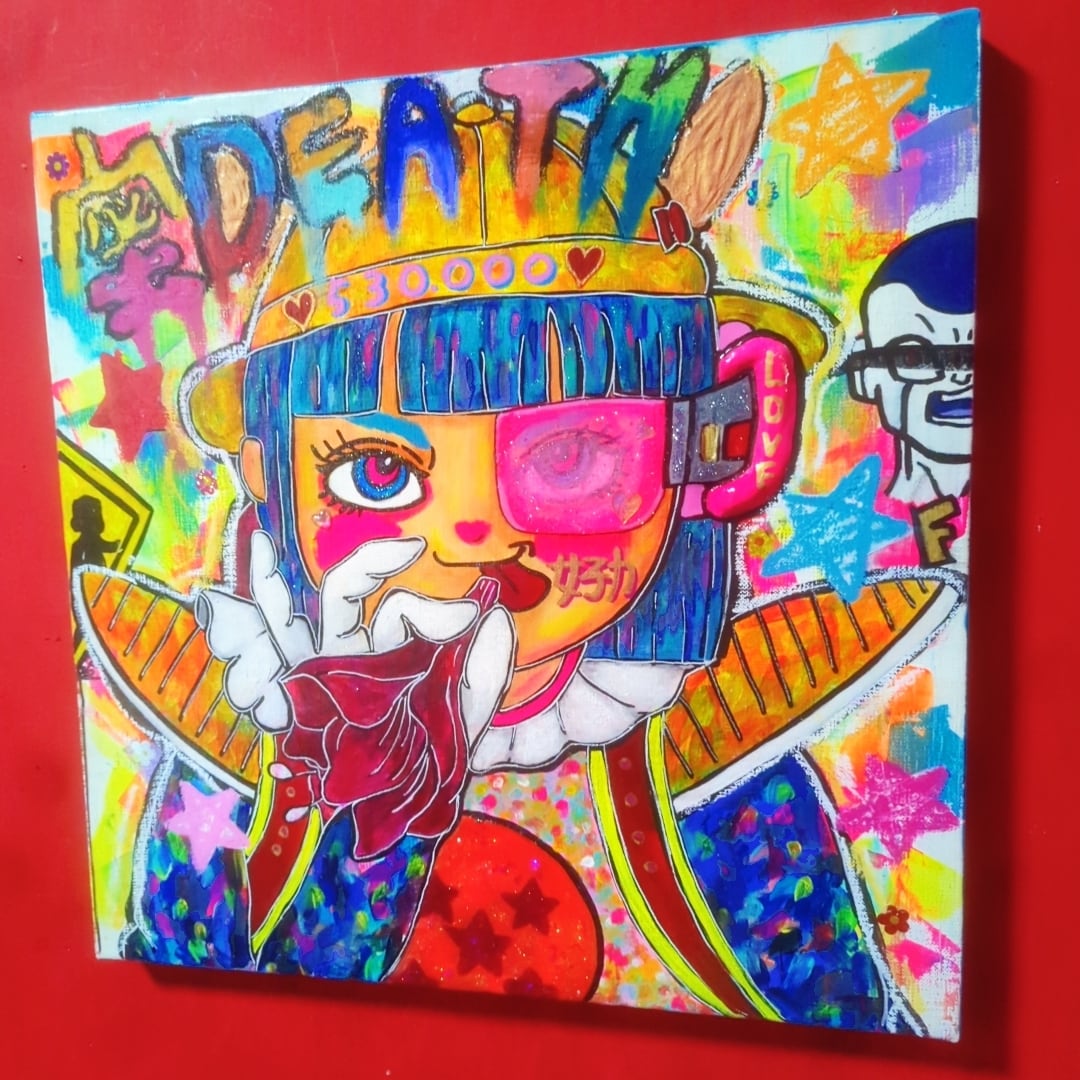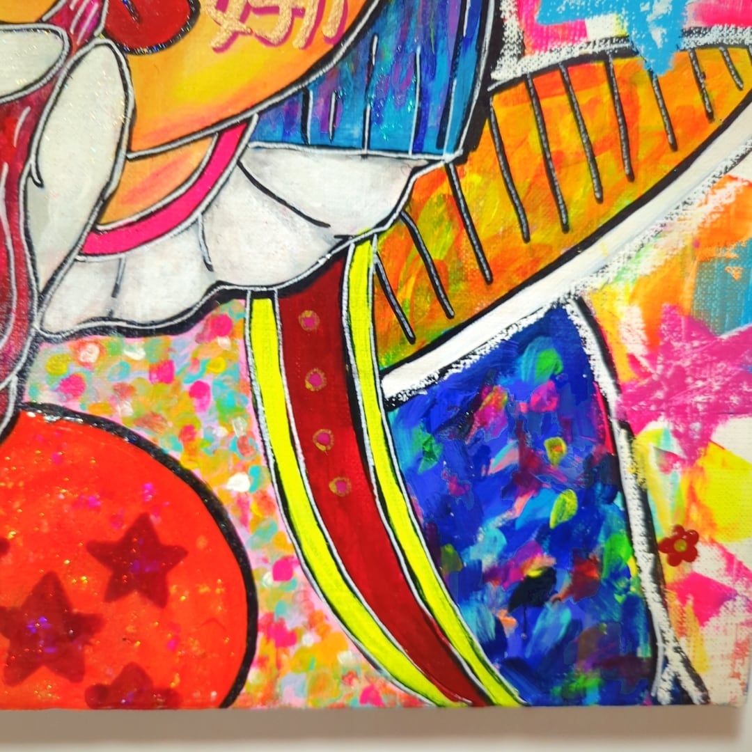 技法:アクリル絵の具,オイルパステル,ポスカ,ラメ,ジェル,アクリルスプレー.コラージュ