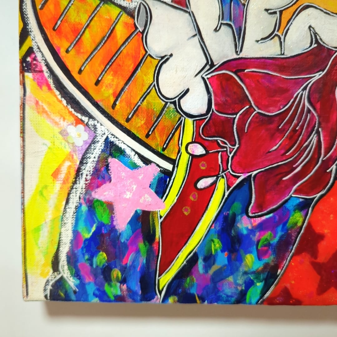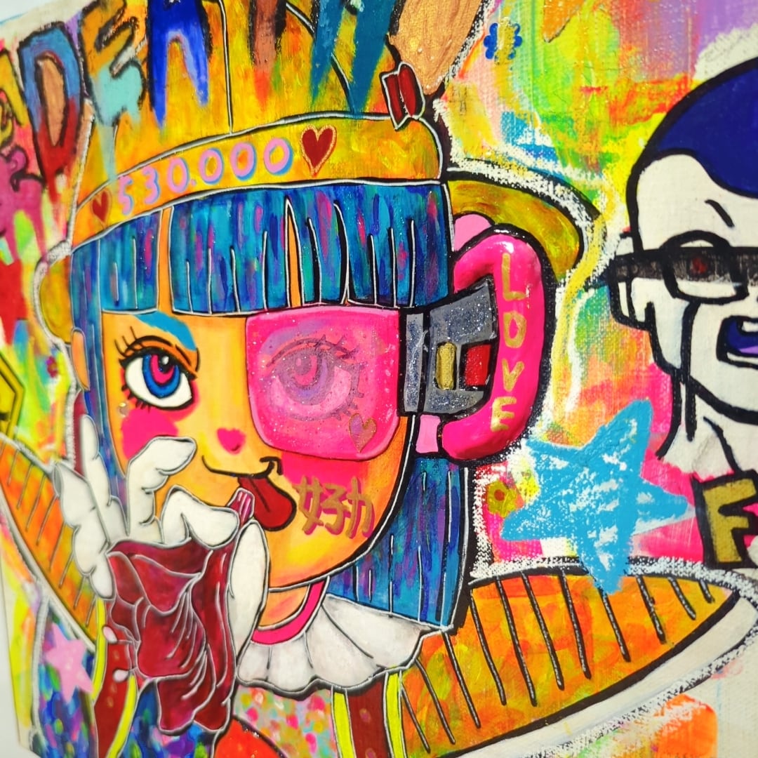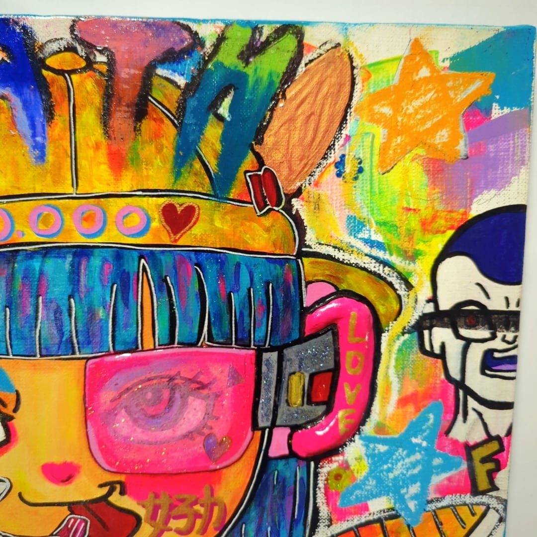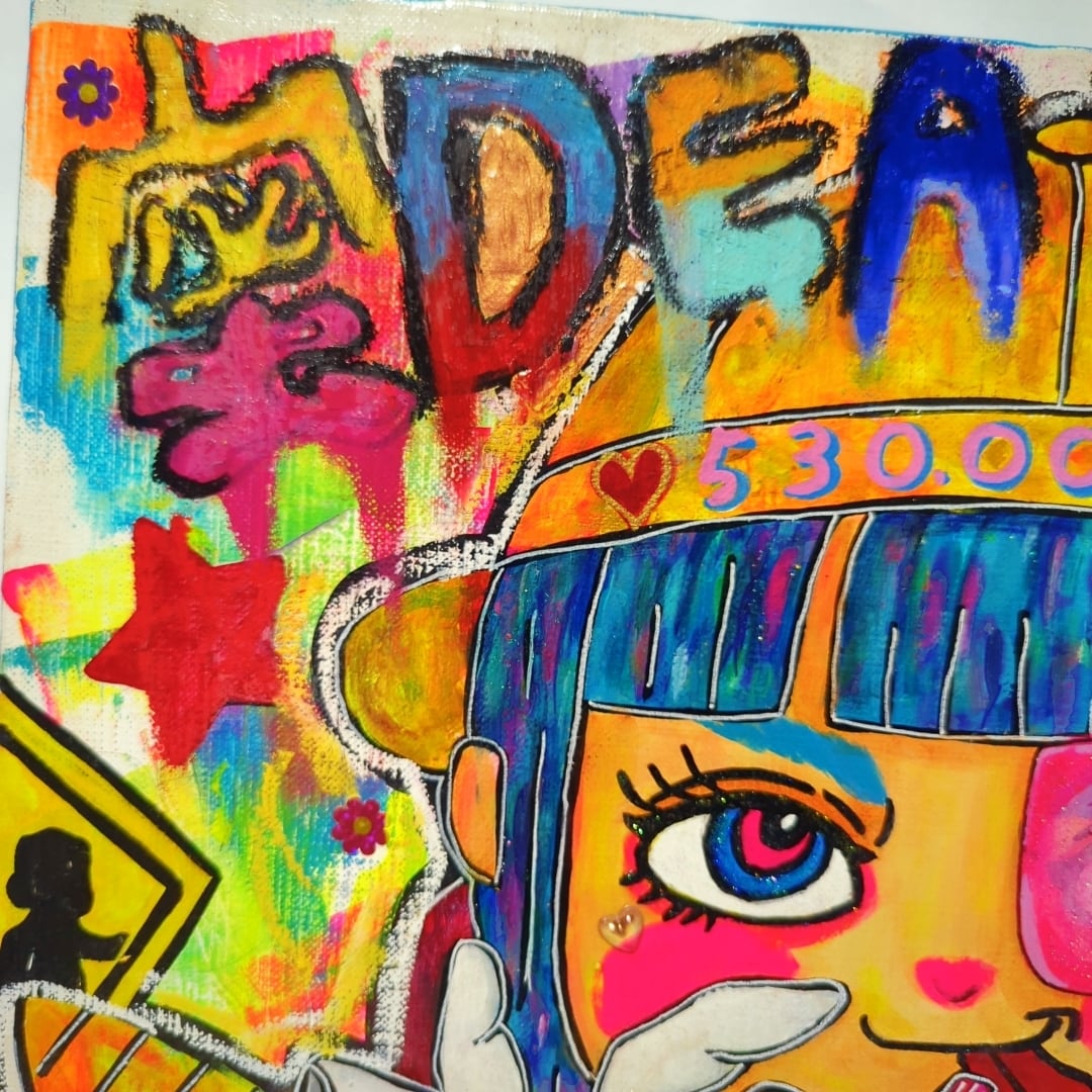 技法:アクリル絵の具,オイルパステル,ポスカ,ラメ,ジェル,アクリルスプレー.コラージュ