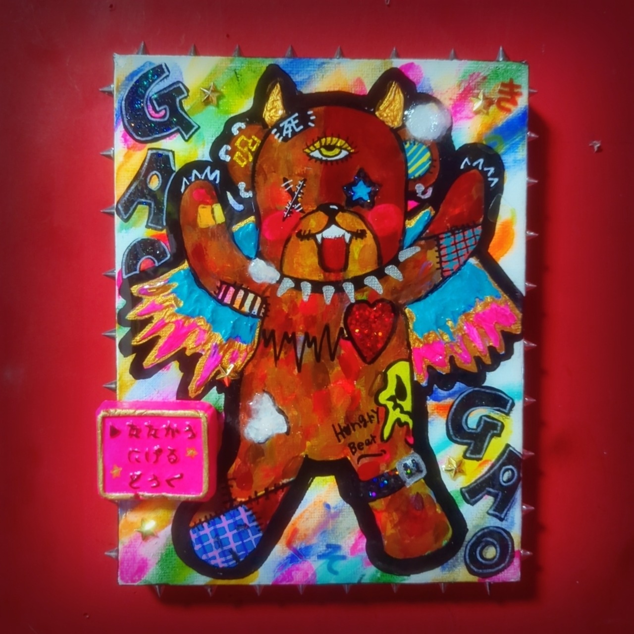 この作品は、アクリル絵の具等で描いた後、全体をレジンで固めペカペカキラキラにコーティングしてみました✡表面は他の作品とは違いツルツルしています✡