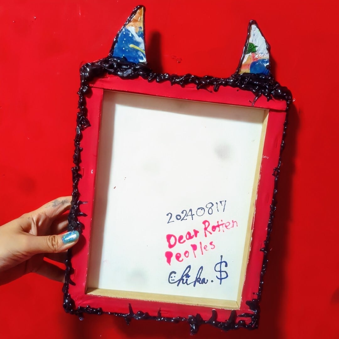 いつもは手作りの木枠額縁にぐねぐねと絡み付けるグルーを今回はキャンバスに直接ぐねぐねさせて段ボールのツノを付けてみました☠♡