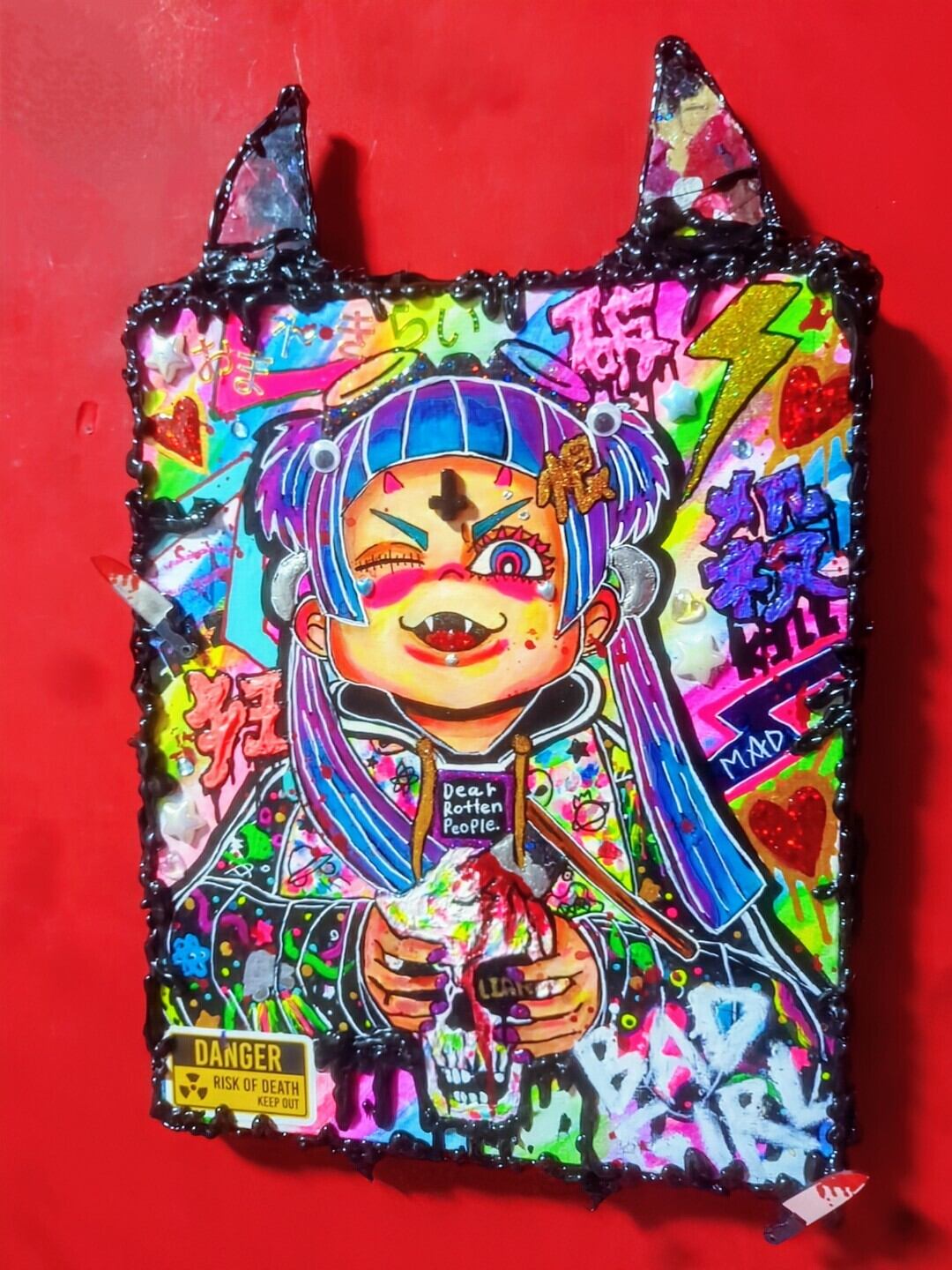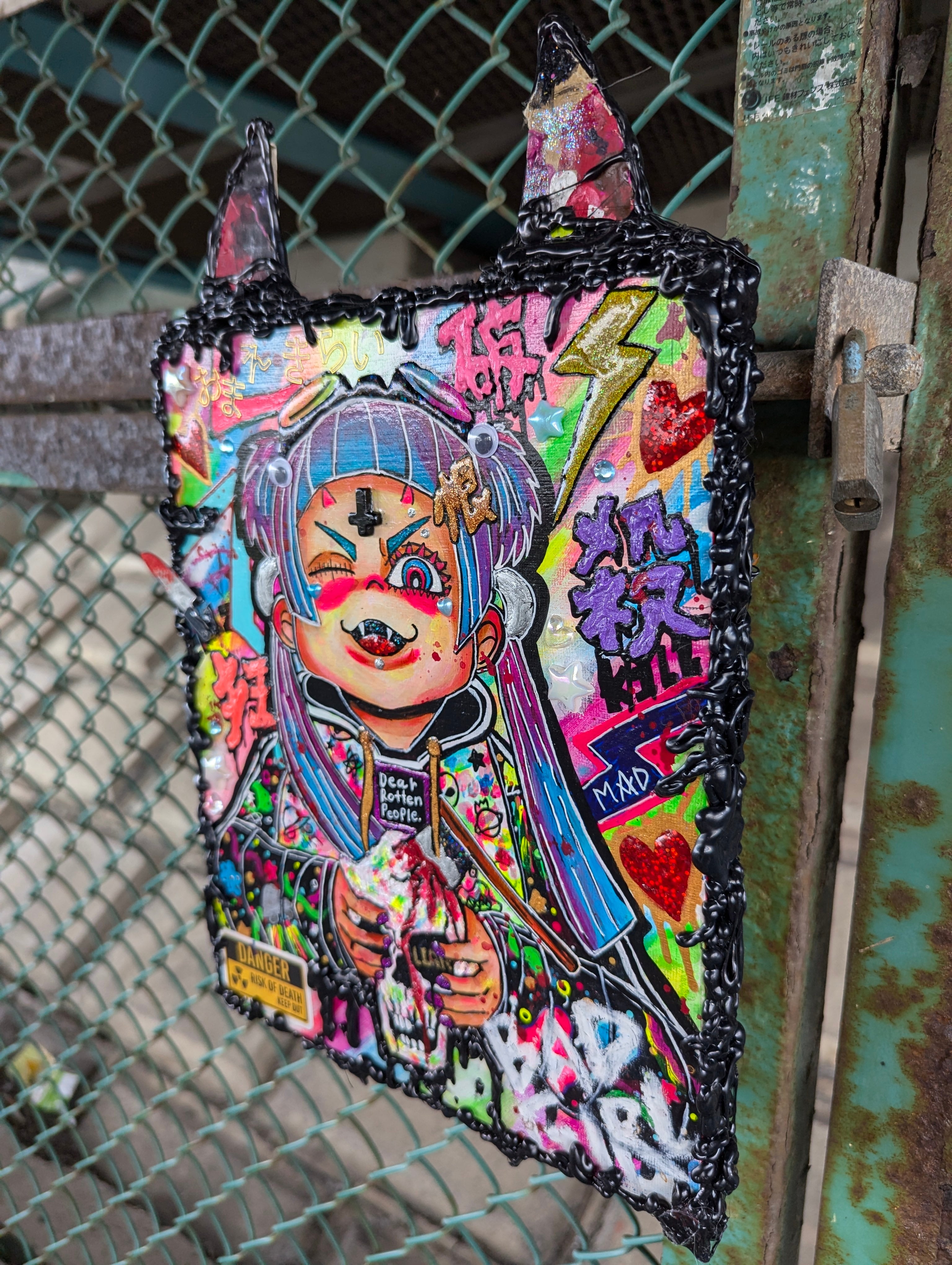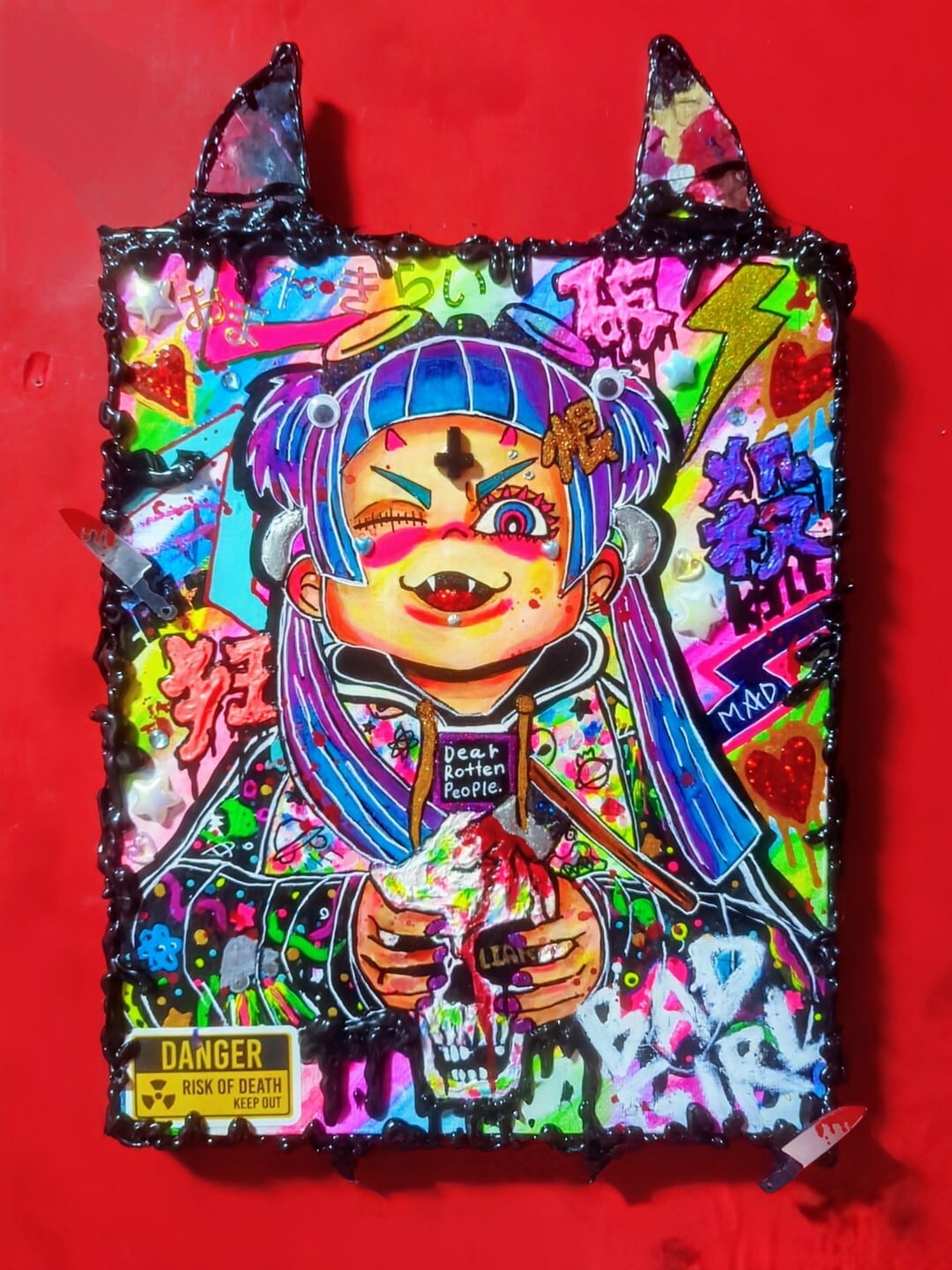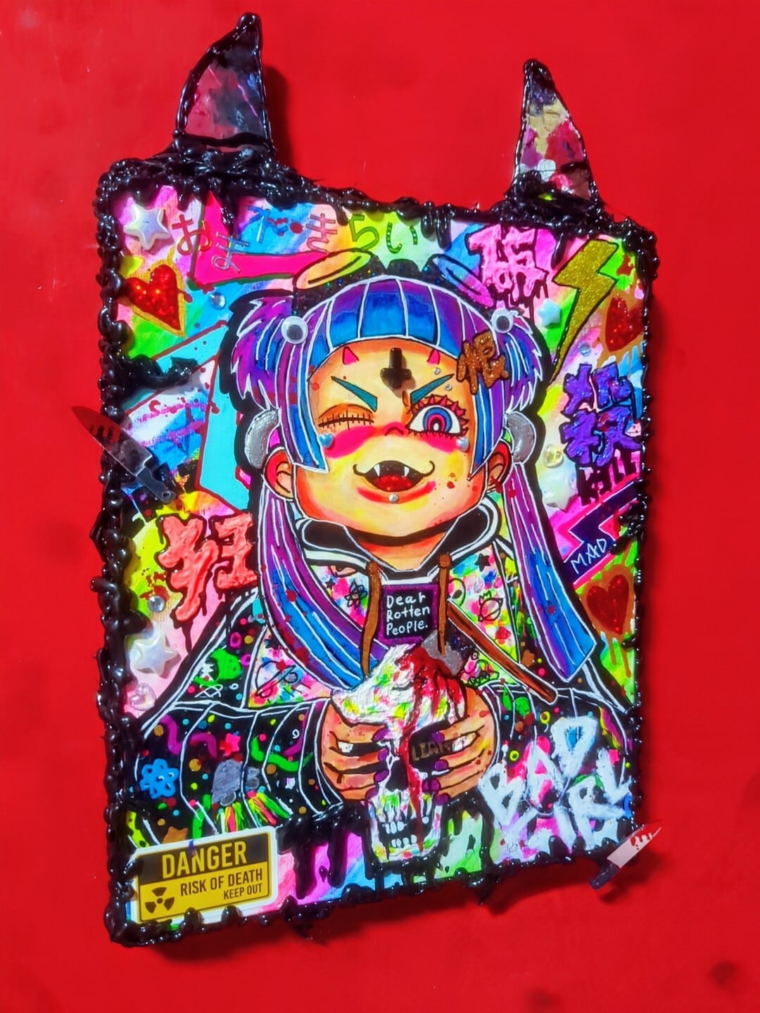イラストっぽい女の子を描くアーティストは多くいる中どうすれば自分らしい【女の子】が描けるか模索した後、可愛いだけじゃない【怒り、憎しみ、悲しみ、皮肉】等のドロドロした感情を描こうと決意。